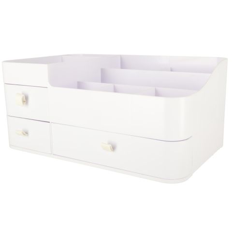 Nowoczesny, minimalistyczny design w eleganckiej bieli sprawia, że organizer wkomponuje się w każde wnętrze – zarówno na toaletce w sypialni, jak i na półce w łazience.
