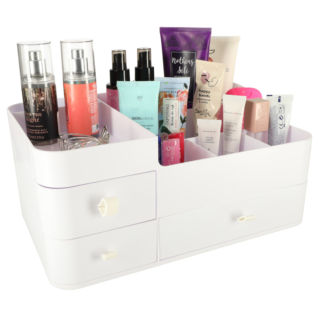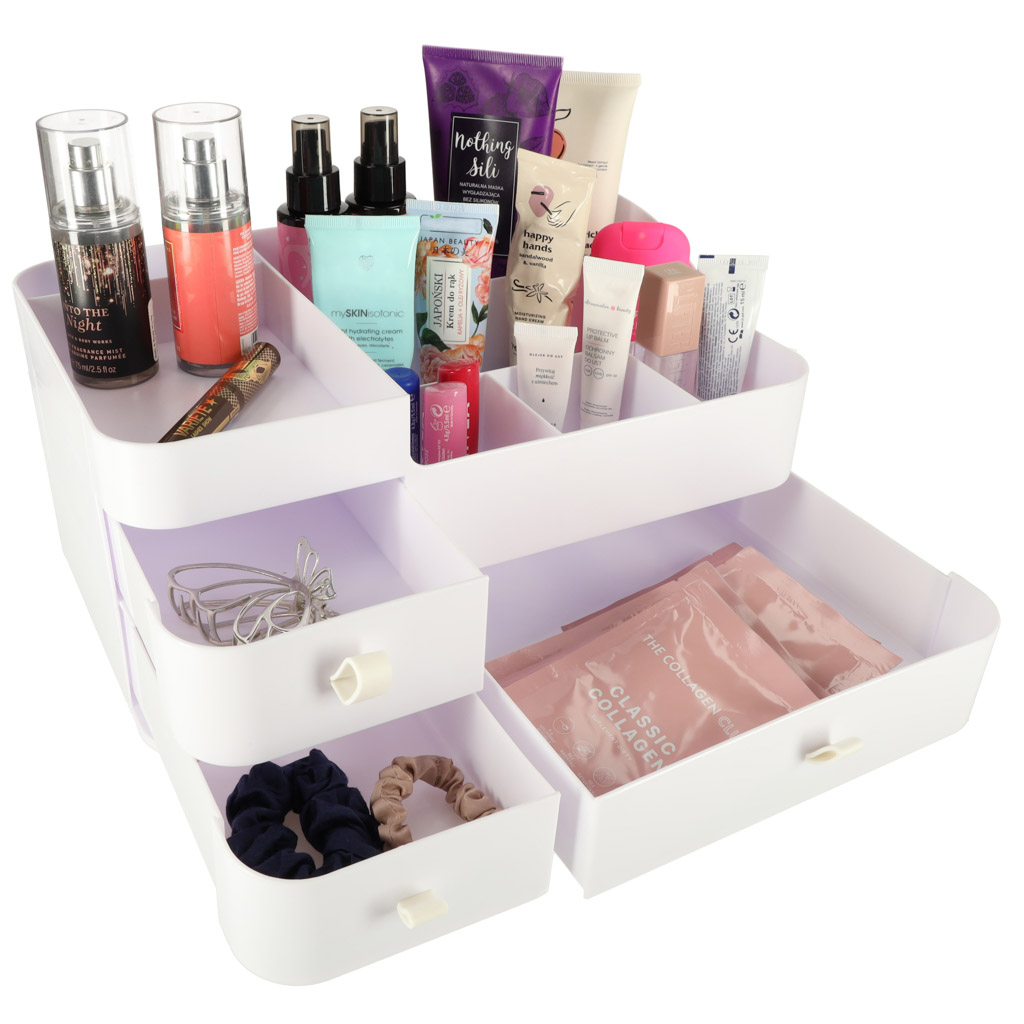 Nowoczesny, minimalistyczny design w eleganckiej bieli sprawia, że organizer wkomponuje się w każde wnętrze – zarówno na toaletce w sypialni, jak i na półce w łazience.