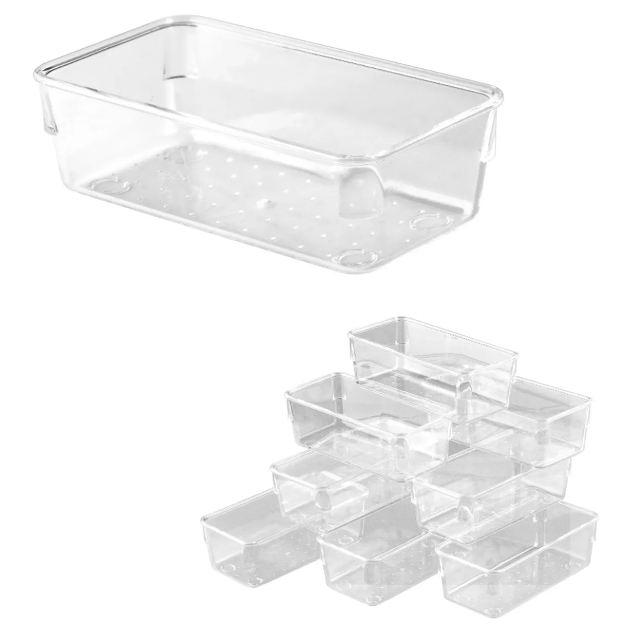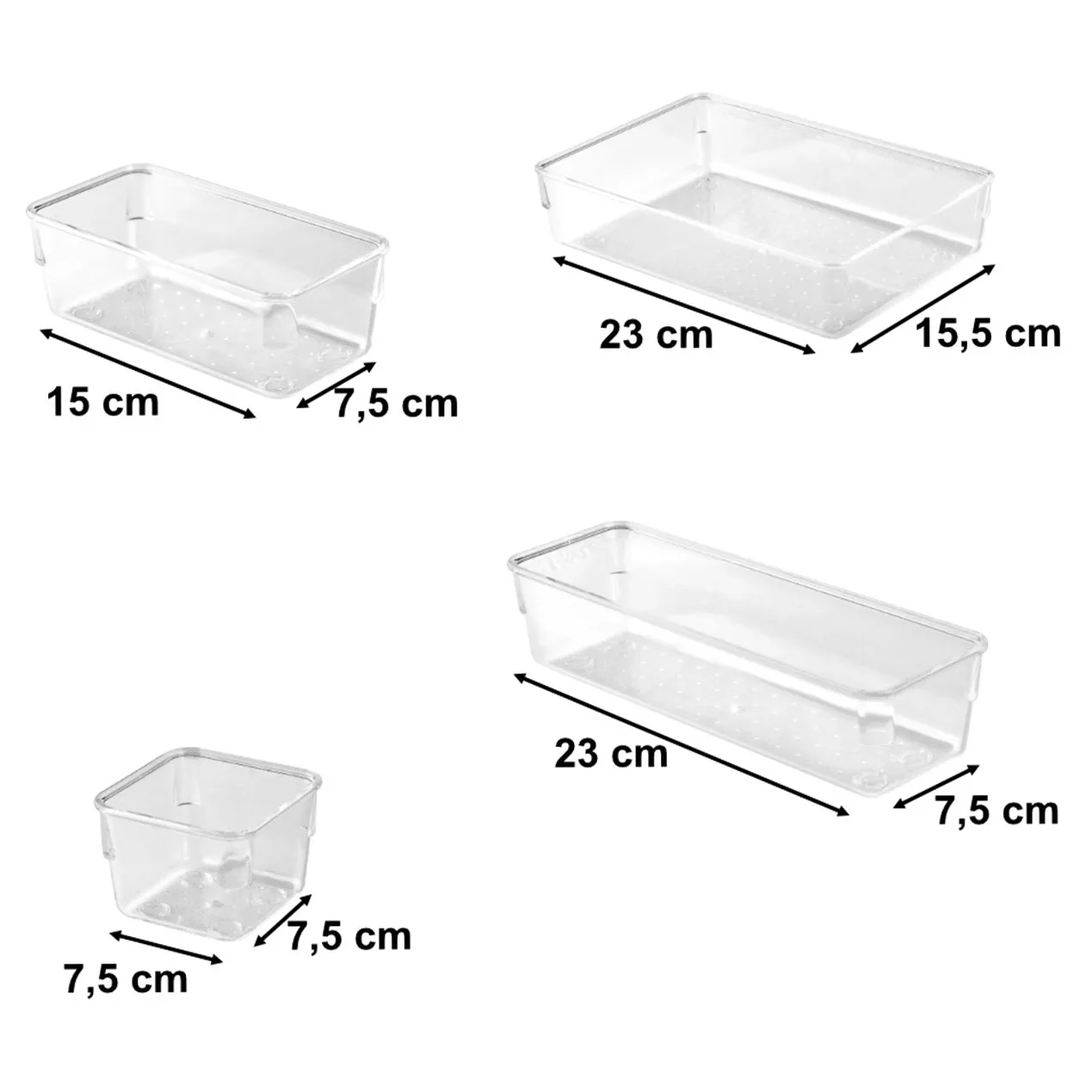 Organizery dostępne w czterech różnych rozmiarach, które umożliwiają przechowywanie zarówno drobnych, jak i większych przedmiotów. Różnorodność wymiarów pozwala na swobodne dopasowanie do każdego miejsca – szuflad, półek, blatów czy biurek.