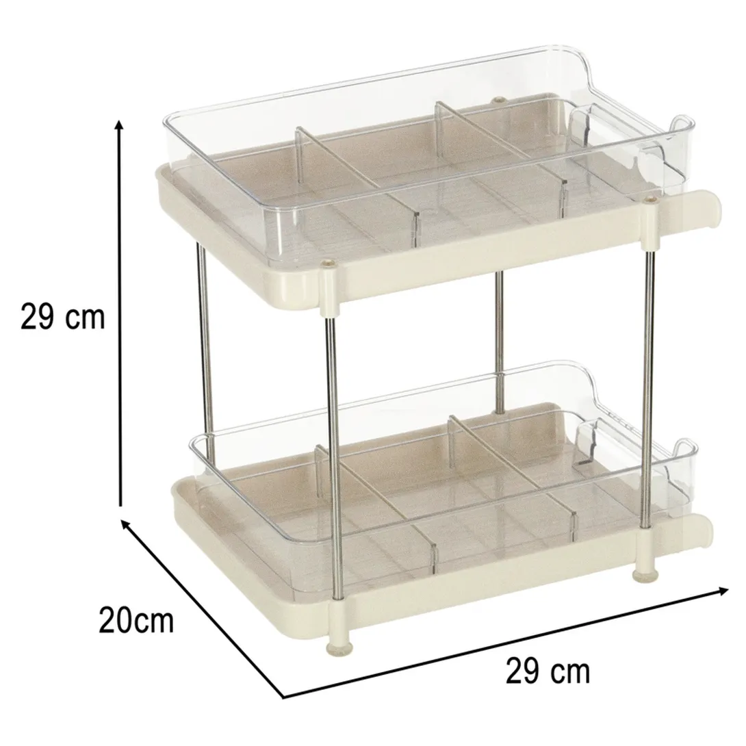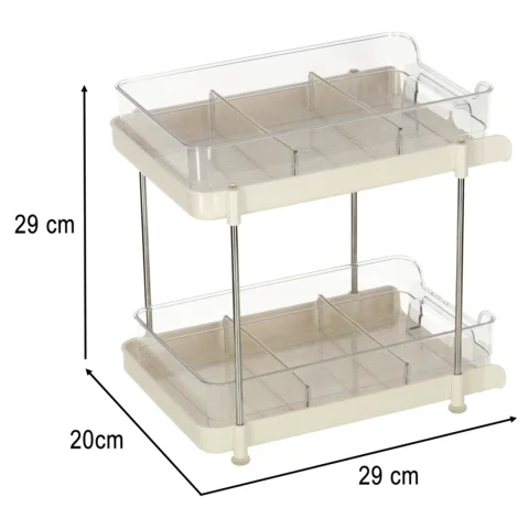 Organizer składa się z dwóch poziomów, co zapewnia dodatkową przestrzeń do przechowywania. Każda z półek posiada przegródki, co umożliwia posegregowanie drobniejszych przedmiotów.