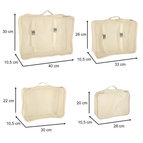 Beżowe organizery do walizki 8 sztuk. Ułatwiające zachowanie porządku w bagażu. Doskonałe na podróż, jak i do używania w domu. Tworzywo: poliester. Wym. Największego organizera: 40 cm x 30 cm x 10,5 cm.