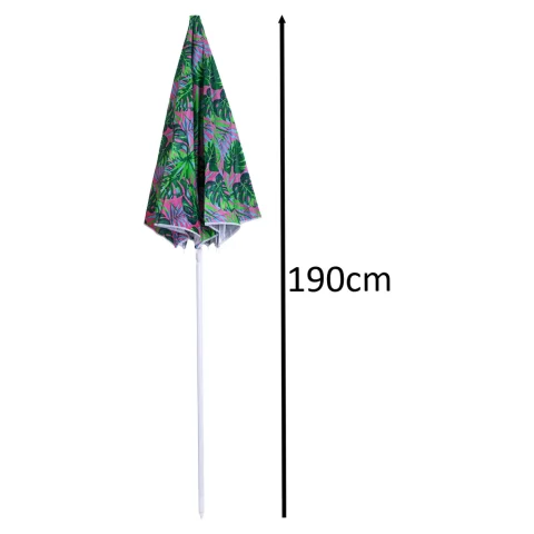 Składany parasol przeciwsłoneczny, który zapewni cień w słoneczne letnie dni i ochroni od szkodliwych promieni UV. Możliwość przechylenia parasola. Ciekawy design w liście monstery. Tworzywo: metal + poliester. Średnica: 150cm. Max. wysokość: 190cm.