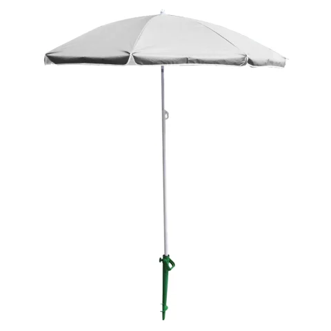 Parasol plażowo-ogrodowy o średnicy czaszy 150 cm z dwuelementową rurką stalową i regulacją wysokości w zakresie 140–180 cm (195 cm z końcówką montażową). Tkanina z górą szarą, spodem srebrnym z filtrem UV. W zestawie przedłużka i szpikulec z tworzywa
