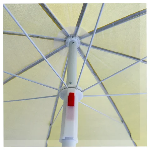 Parasol plażowo-ogrodowy o średnicy czaszy 150 cm z dwuelementową rurką stalową i regulacją wysokości w zakresie 140–180 cm (195 cm z końcówką montażową). Tkanina z górą żółtą, spodem srebrnym z filtrem UV. W zestawie przedłużka i szpikulec z tworzywa