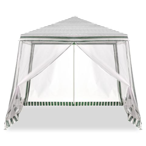 Wymiary podstawy: 3 m x 3 m. Wymiary dachu: 2,4 m x 2,4 m. Całkowita wysokość: 2,4 m. Materiał: metal, plastik, mocny materiał PE 90 g/m2. Kolor: biało-zielony. Typ: elegancki pawilon ogrodowy / imprezowy namiot ogrodowy. Ochrona: moskitiera + ochrona UV