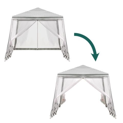 Pawilon ogrodowy 300×300 cm wyposażony jest w cztery ścianki boczne w formie moskitiery, które skutecznie chronią przed uciążliwymi owadami. Ścianki boczne bez okien zapewniają większą prywatność i cień. Dodatkowo, dach odporny na warunki atmosferyczne i ochrona UV chronią przed promieniowaniem słonecznym i lekkim deszczem, tworząc komfortowe zadaszenie ogrodowe.