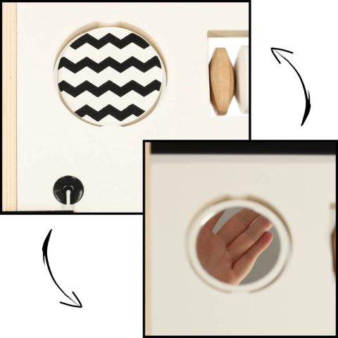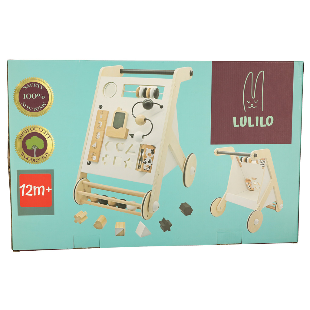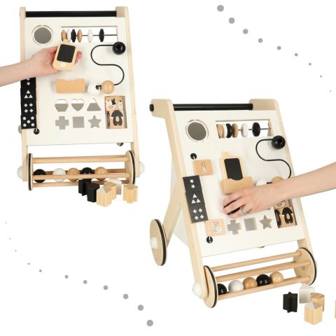 Drewniany pchacz z tablicą interaktywną – sorter, przesuwane klocki, odwracane tabliczki. Połączenie zabawy z nauką! Sorter-pchacz ułatwi naukę chodzenia i zapewni mnóstwo kreatywnej rozrywki. Wiek: 12m+. Wymiary chodzika: 32 cm x 49 cm x 34 cm.