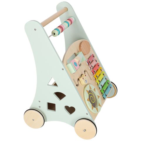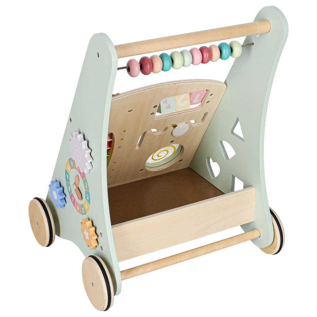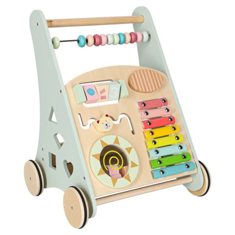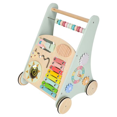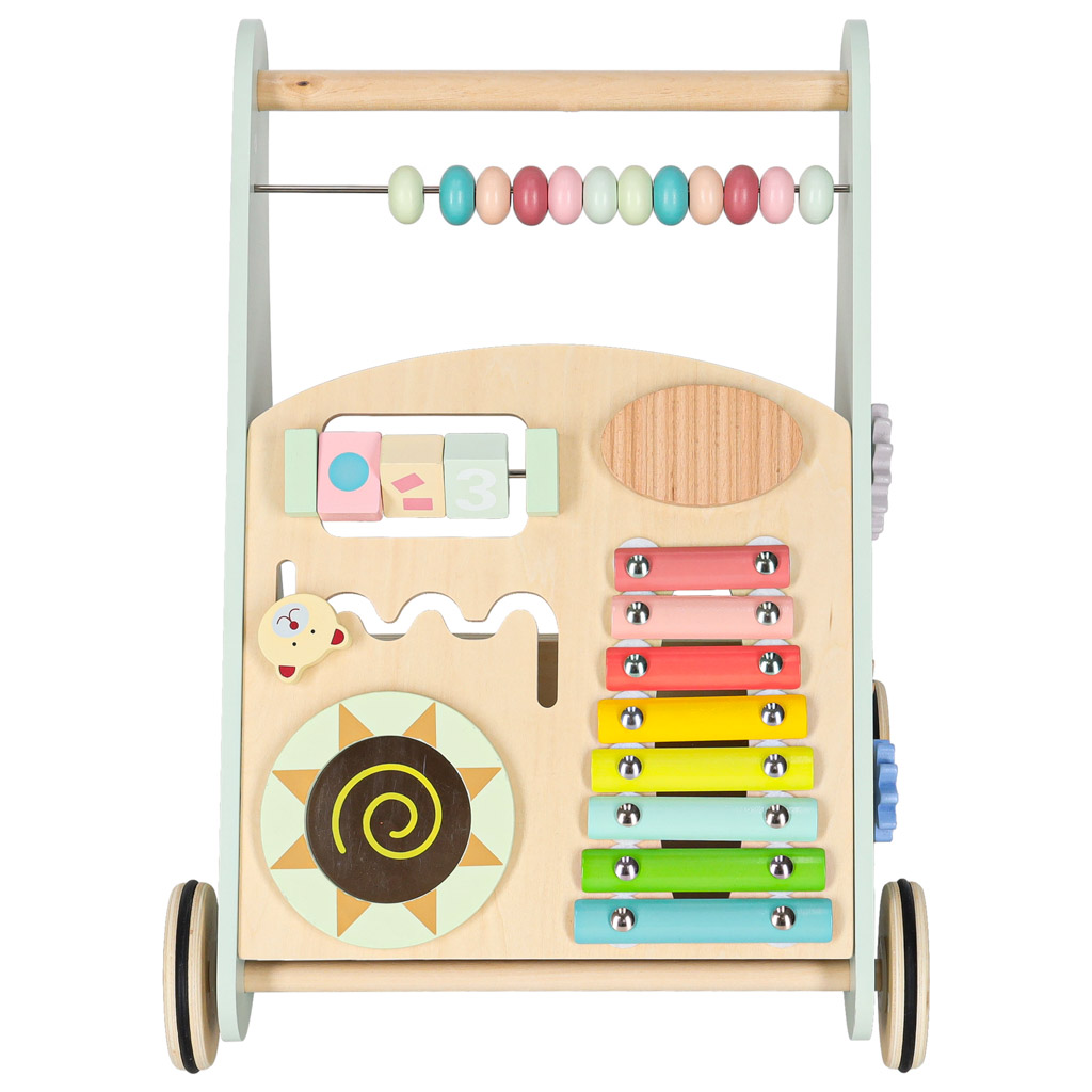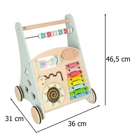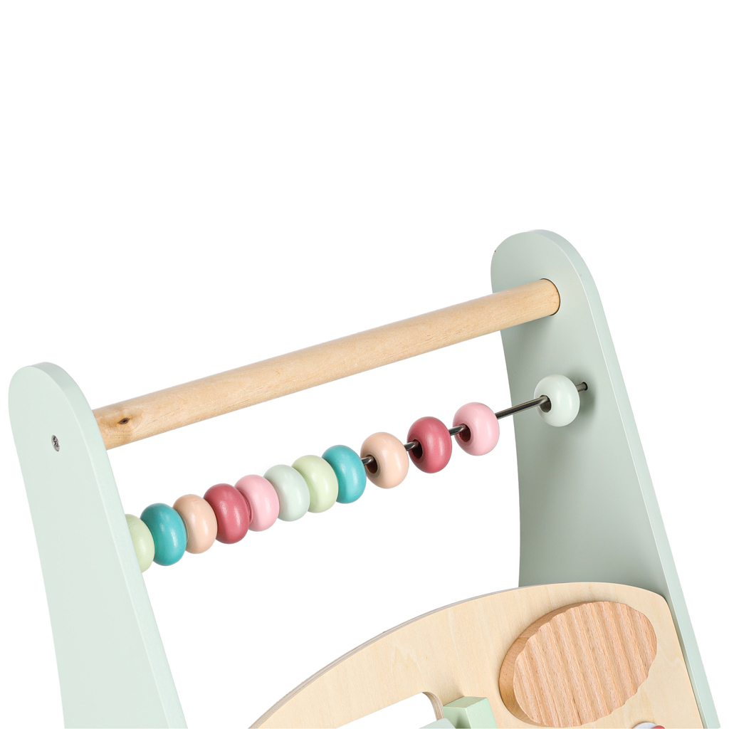 Drewniany chodzik z liczydłem wykonany z naturalnego litego drewna to stabilna, bezpieczna konstrukcja wspierająca naukę chodzenia. Wyposażony w liczydło, cymbałki, sorterek kształtów i kolorowe klocki rozwija motorykę, koordynację i funkcje sensoryczne