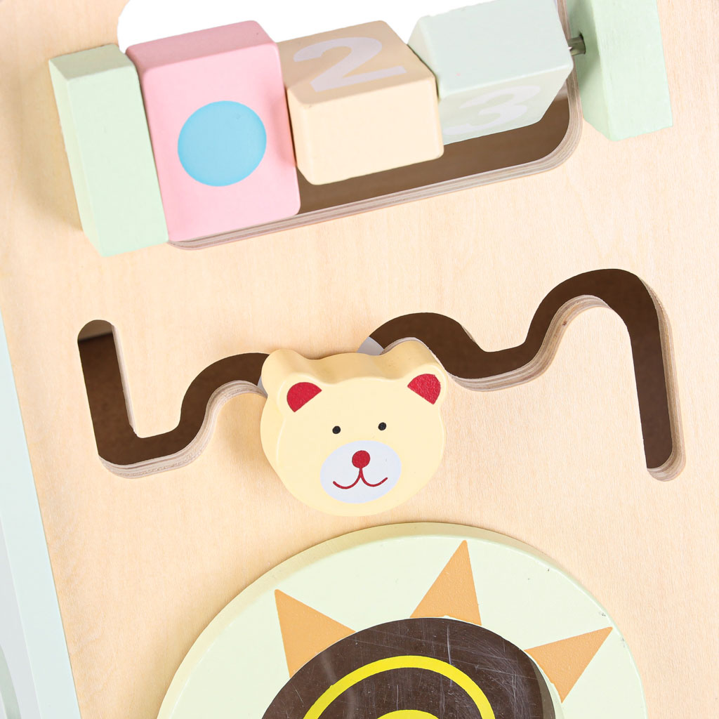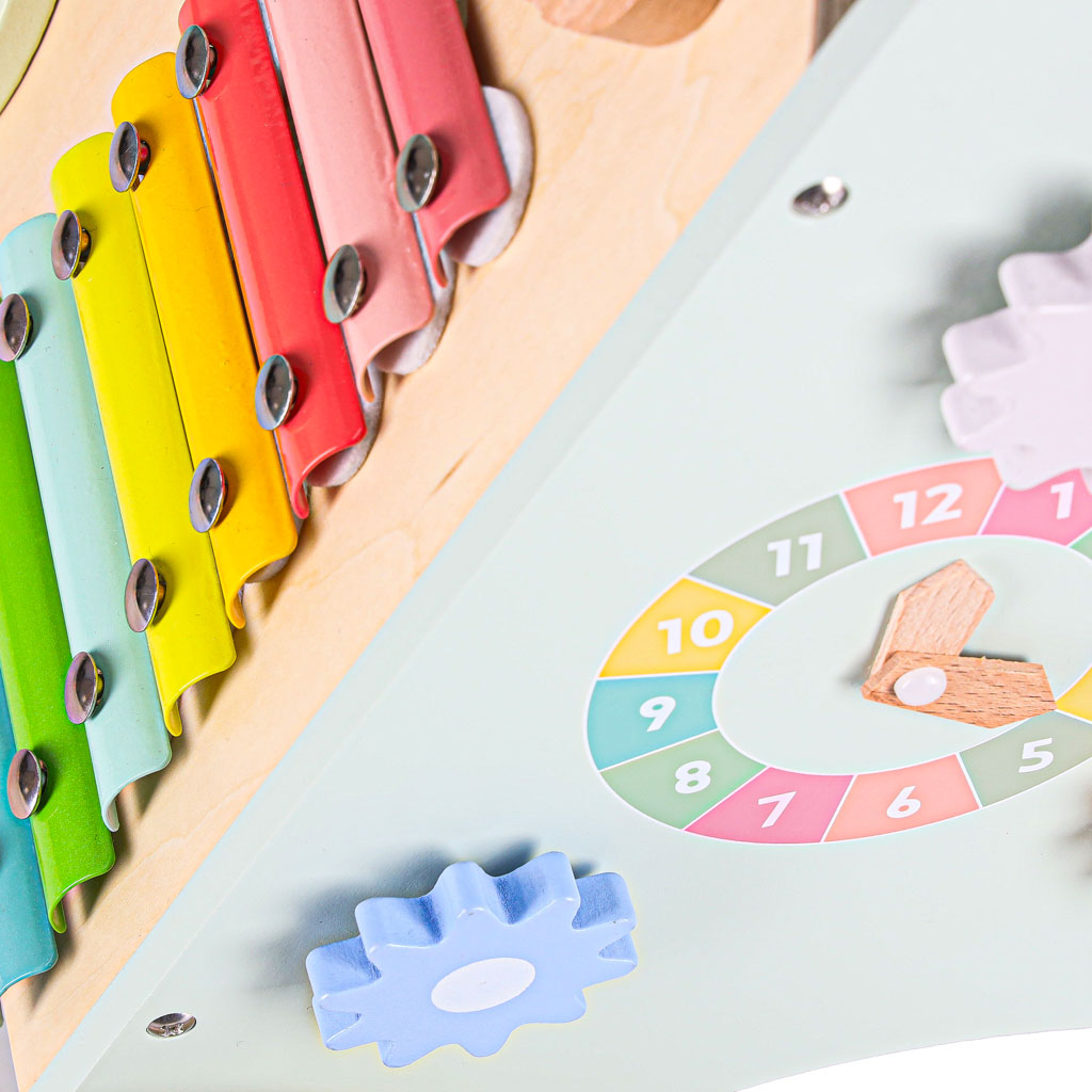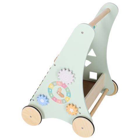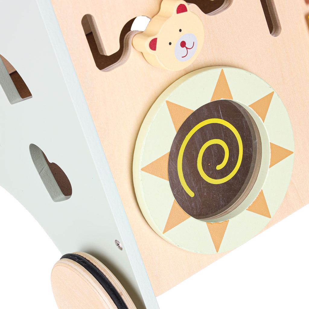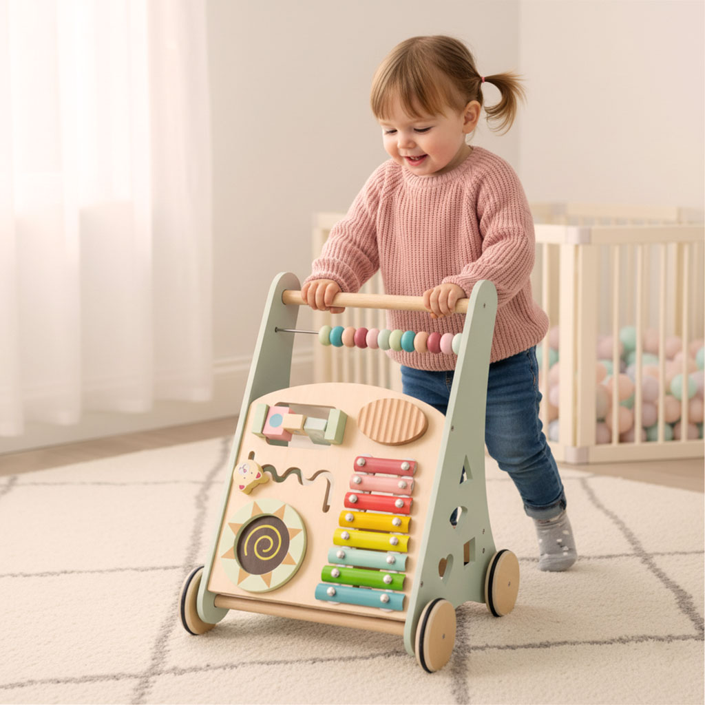 Drewniany chodzik z liczydłem wykonany z naturalnego litego drewna to stabilna, bezpieczna konstrukcja wspierająca naukę chodzenia. Wyposażony w liczydło, cymbałki, sorterek kształtów i kolorowe klocki rozwija motorykę, koordynację i funkcje sensoryczne