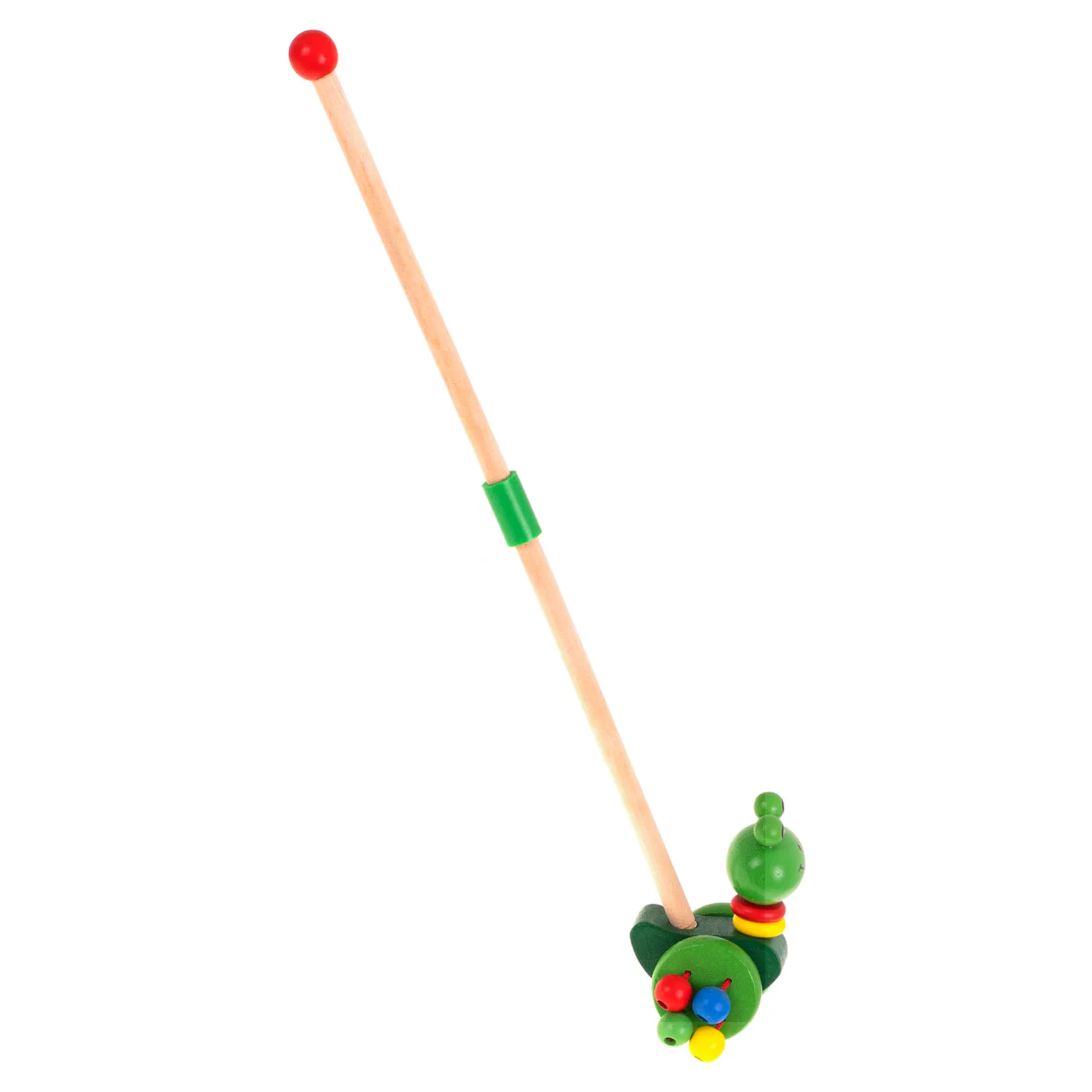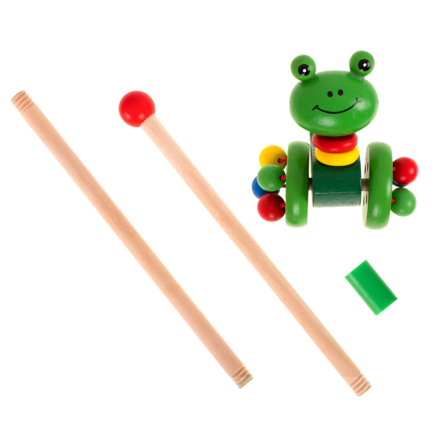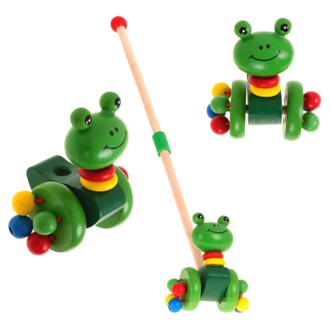 Sympatyczna żabka wykonana z drewna, którą można prowadzić przy pomocy prowadnika.