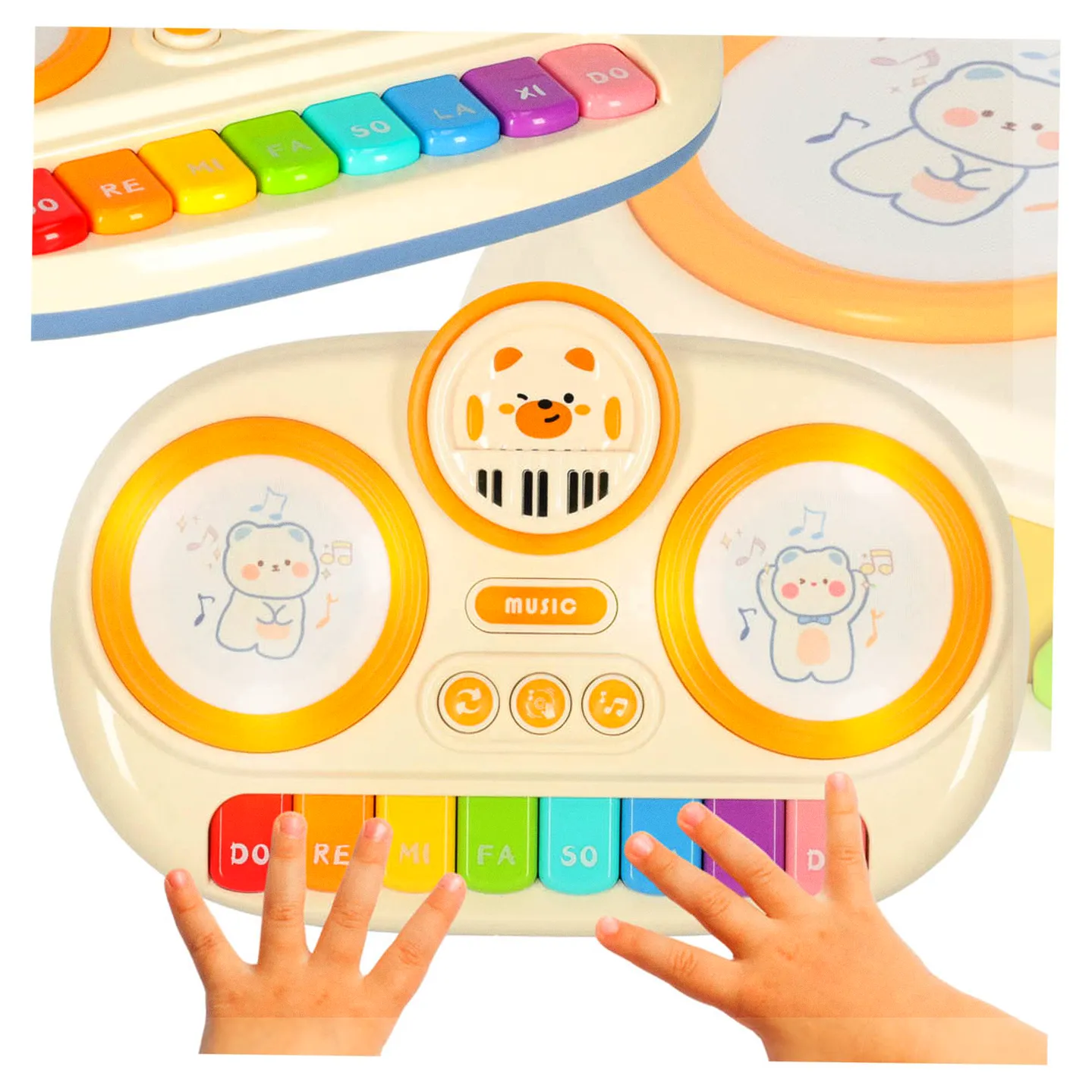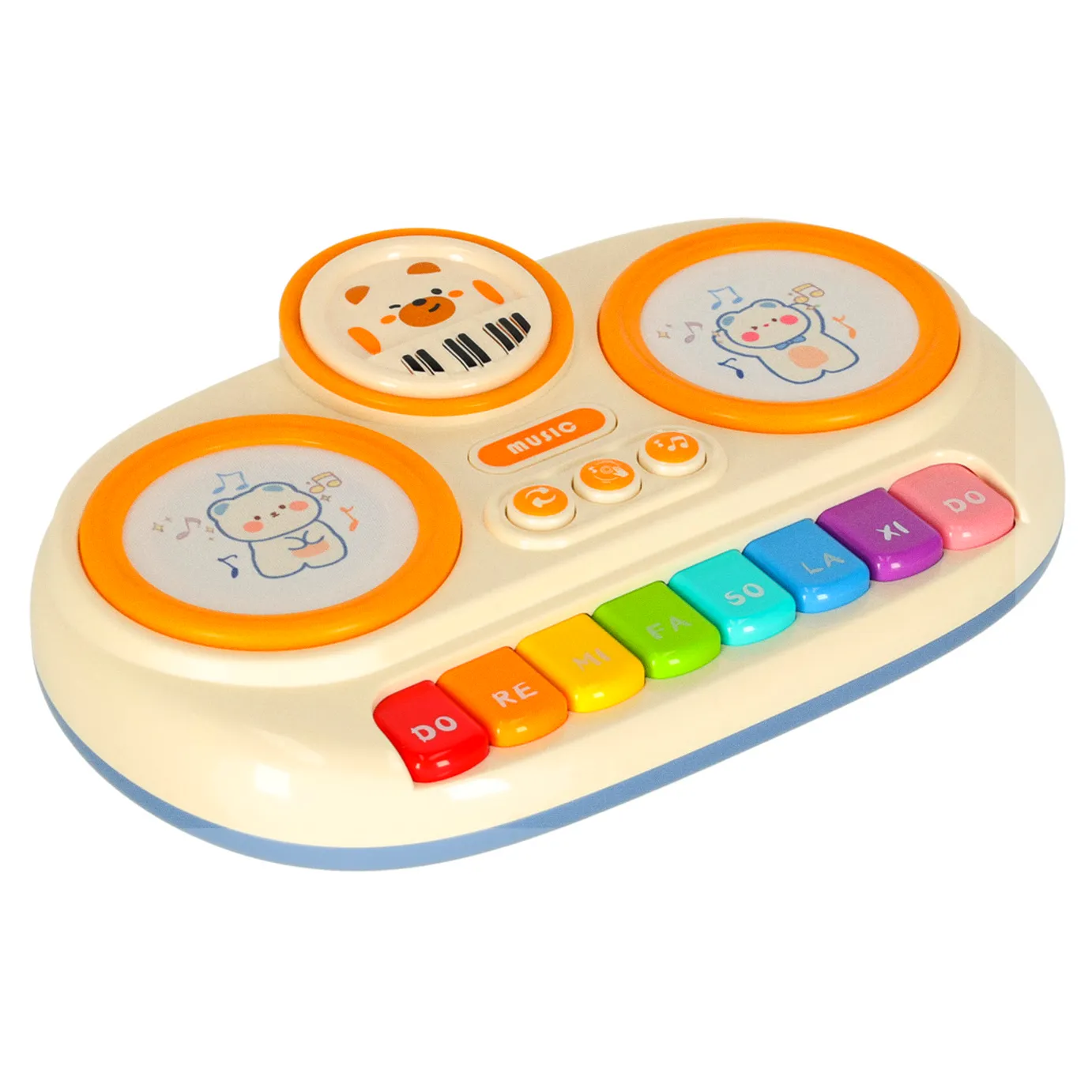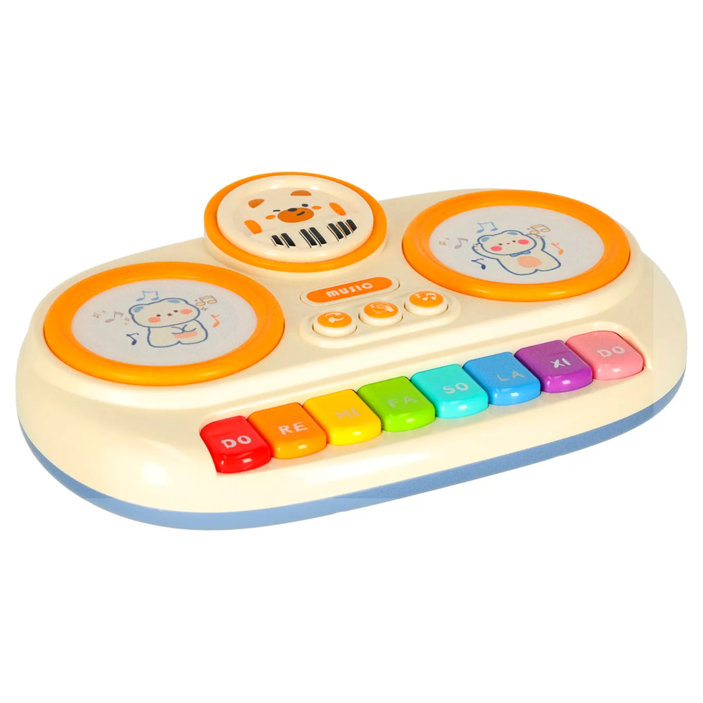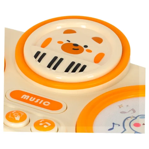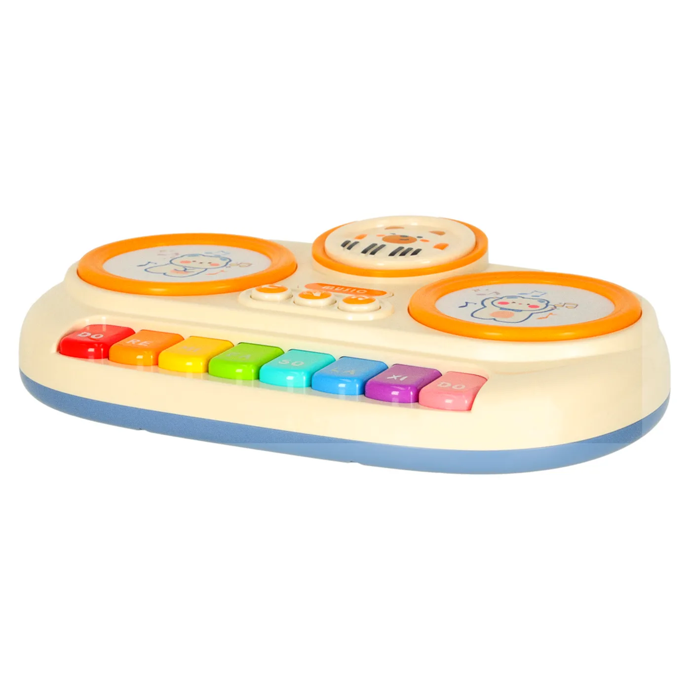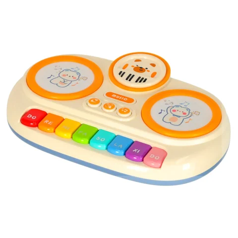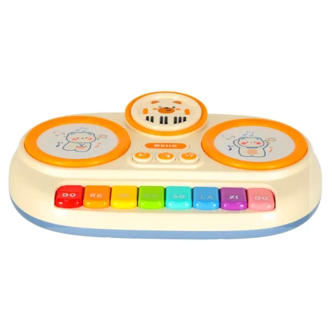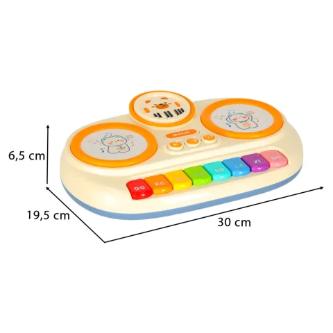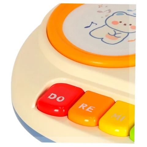 To pianinko edukacyjne zawiera różne tryby gry – od klasycznych dźwięków po efekty bardziej rytmiczne sekwencje wzbogacone światełkami. Idealne do nauki kolorów, rytmu oraz rozwijania słuchu muzycznego. Dodatkowo na uwagę zasługuje również ciekawa funkcja – miękko wykończone, okrągłe elementy, które działają jak mini perkusja. Wystarczy, że maluch uderzy w nie dłonią, a zabawka odtwarza rytmiczne dźwięki bębnów z melodyjką, dając dziecku poczucie sprawczości i radości z aktywnej zabawy.