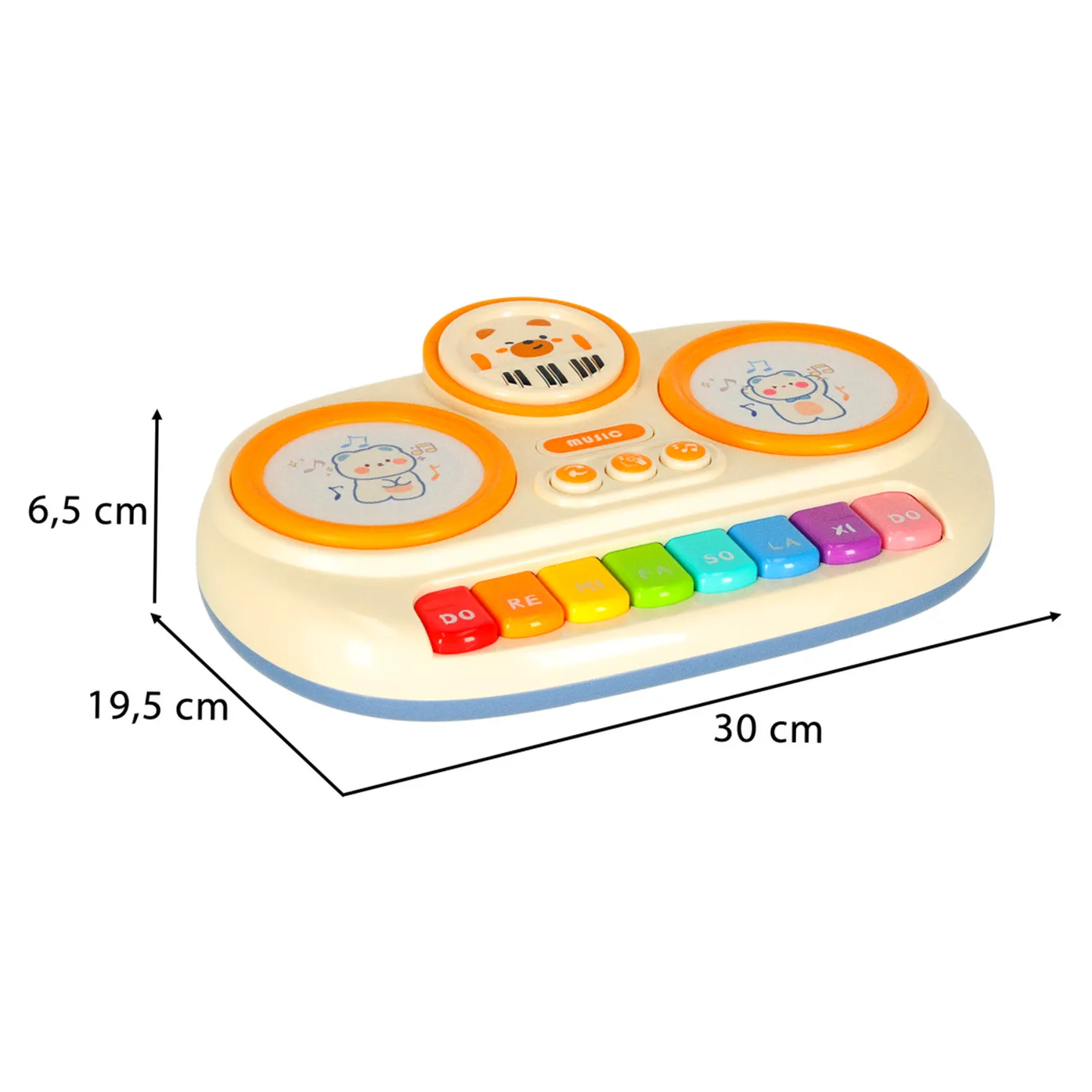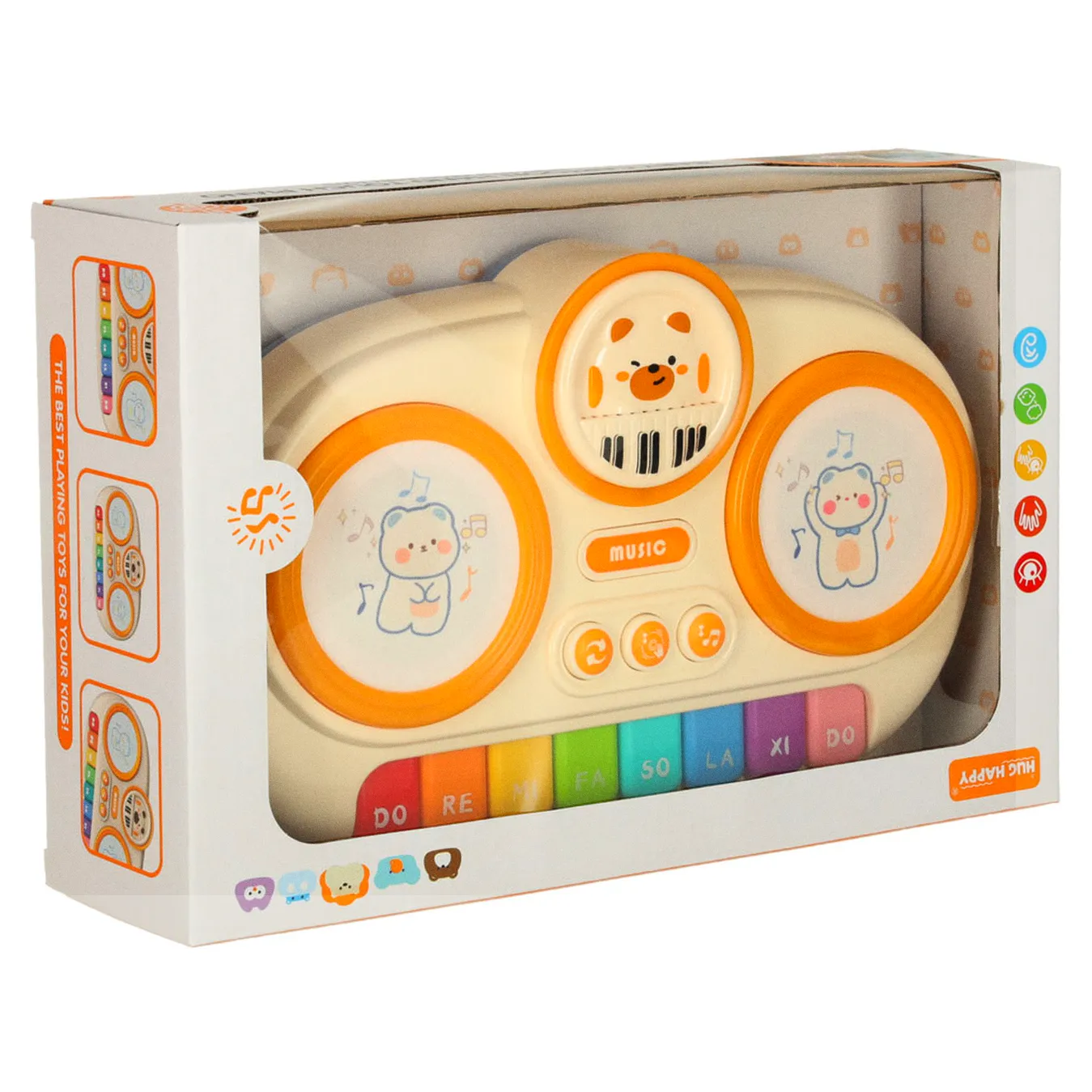 Kolor: beżowy, pomarańczowy, kolorowy. Materiał: wysokiej jakości tworzywo sztuczne. Wymiary: 30 x 19,5 x 6,5 cm. Efekty: dźwiękowe i świetlne. Zasilanie: 3x baterie AA (brak w zestawie). Wiek: 12m +. Opakowanie: oryginalne, kolorowe pudełko producenta. P