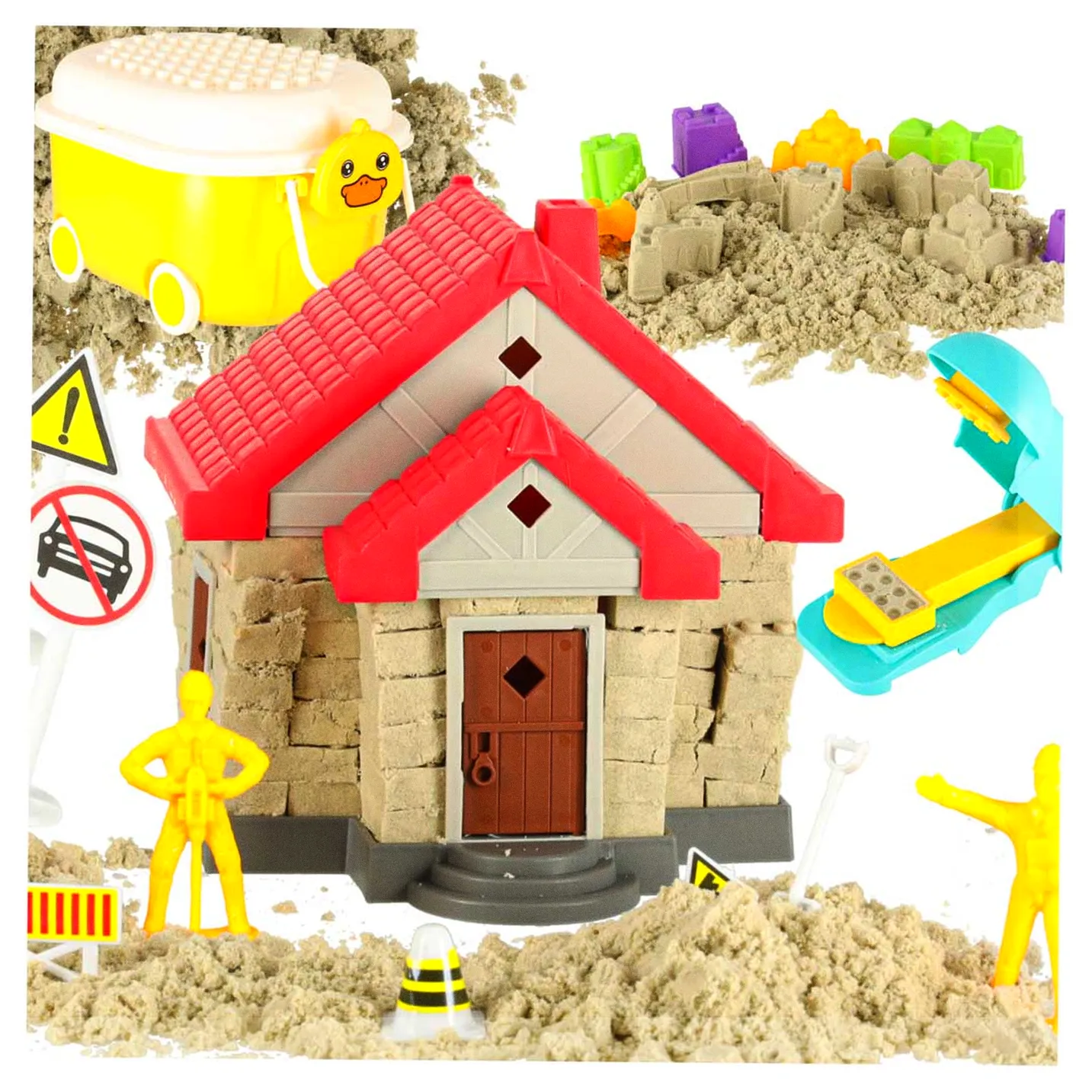 Dzięki dodatkom takim jak foremki do robienia babek i maszynka do tworzenia cegieł z piasku, dzieci mogą tworzyć rozmaite kształty, ozdabiać swoje konstrukcje i eksperymentować z pomysłami. To zestaw, który rozbudza kreatywność i dostarcza dzieciom zabawy na długie godziny. Figurki, znaki drogowe i naklejki zamieniają zwykłe lepienie w realistyczną budowę, a każda nowa scena pobudza wyobraźnię dziecka.