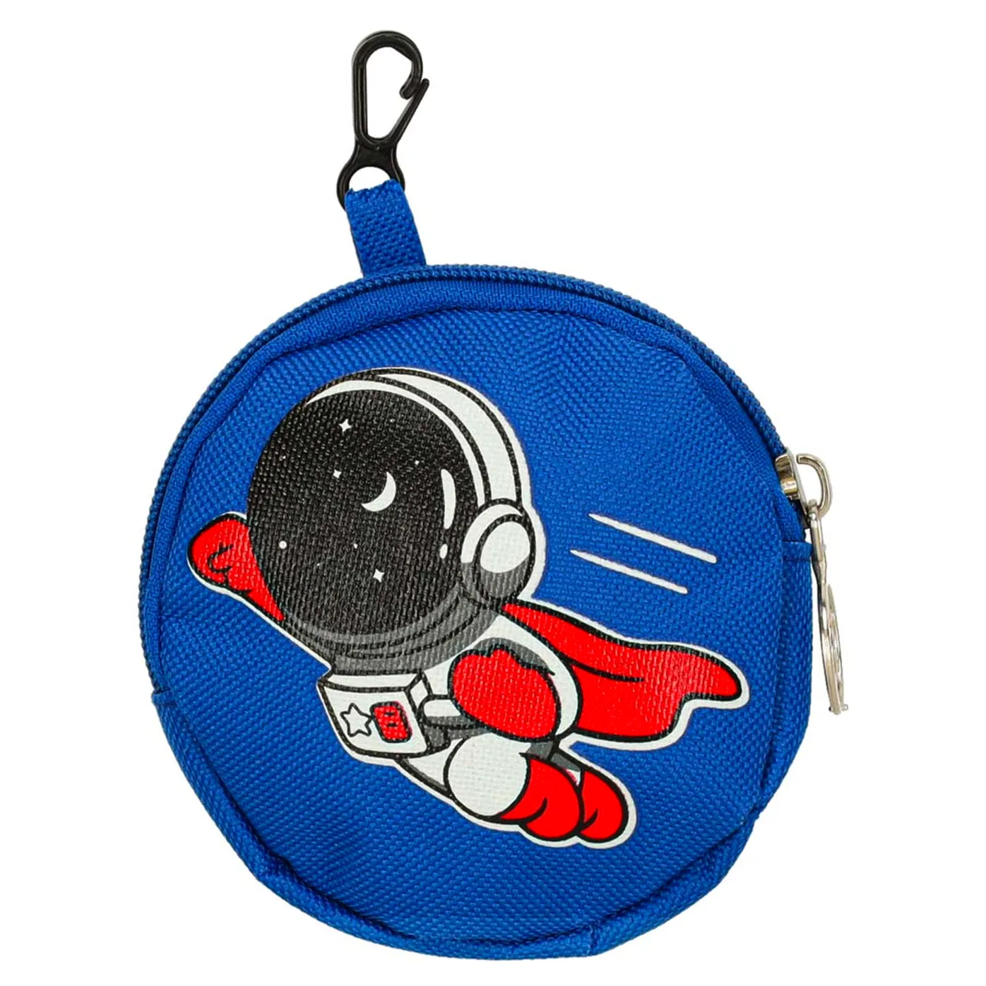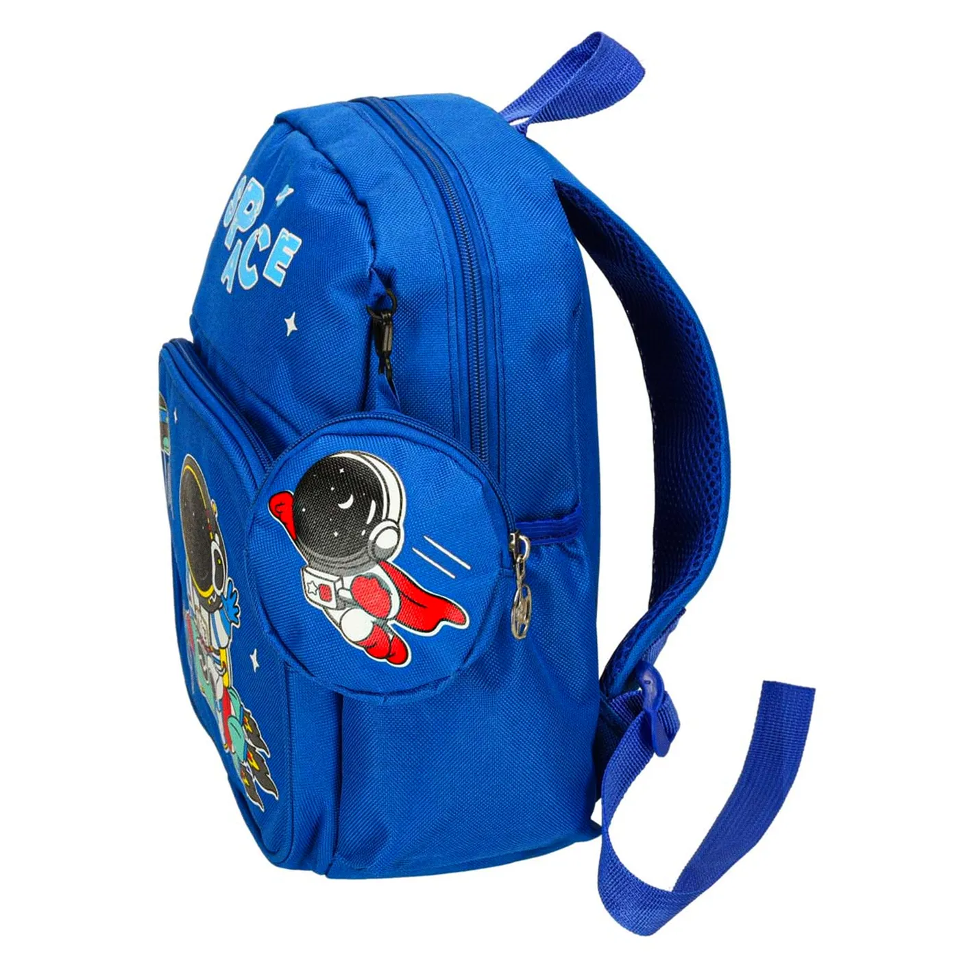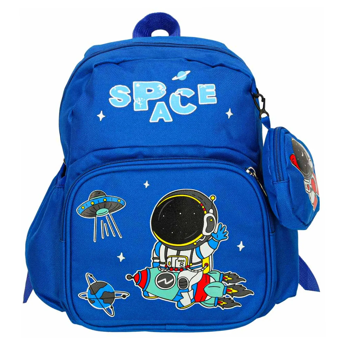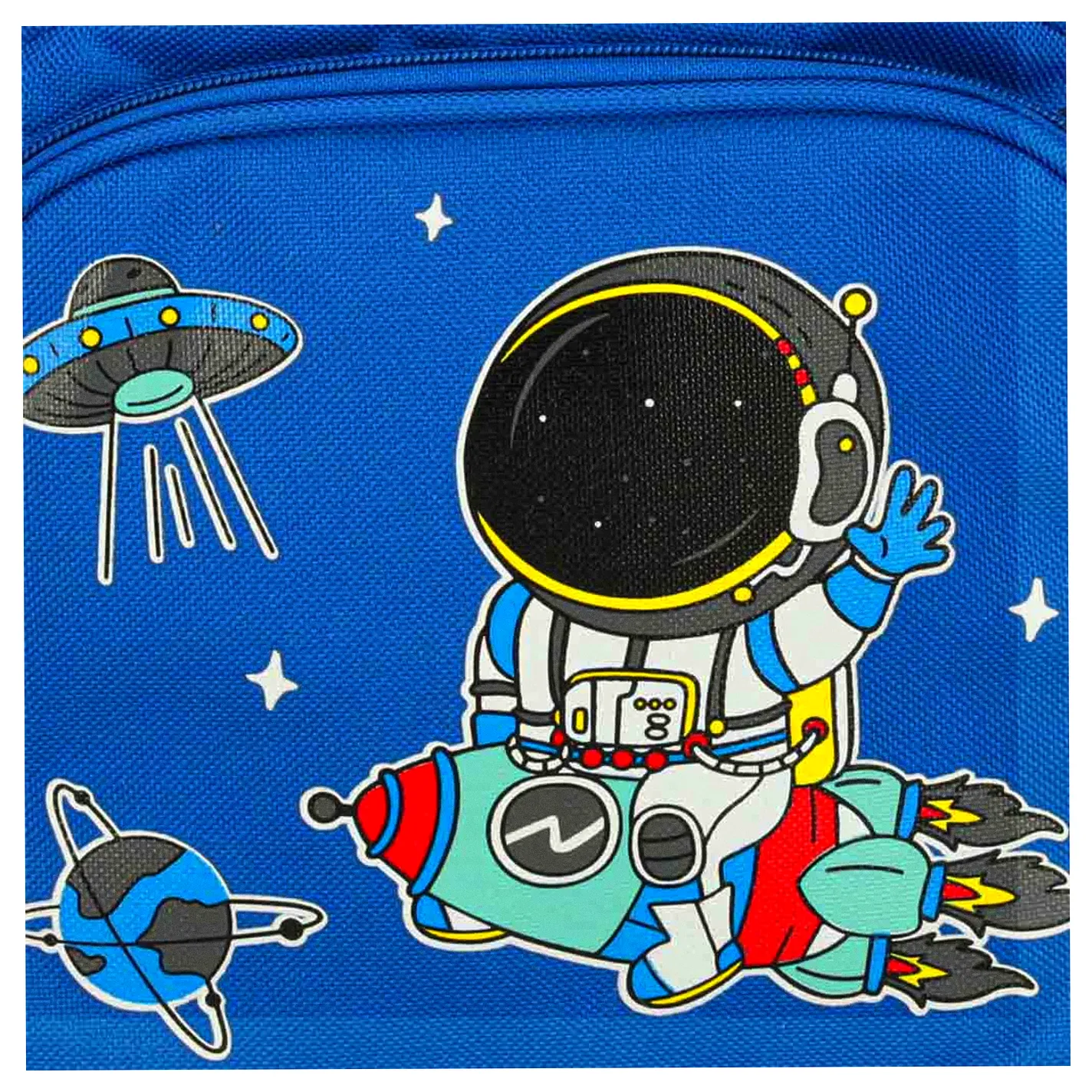 Plecak dziecięcy z grafiką astronauty, wykonany z lekkiego i wytrzymałego nylonu. Wyposażony w dużą komorę główną, przednią kieszeń na suwak, odczepianą okrągłą saszetkę oraz dwie boczne kieszonki. Regulowane szelki, pojemność ok. 7,5 L