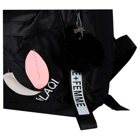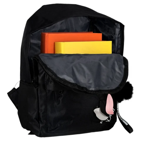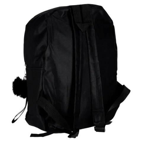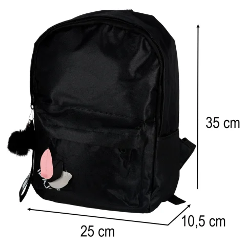 Czarny plecak szkolny o wymiarach 35 cm x 10,5 cm x 25 cm jest przeznaczony dla dzieci i młodzieży chodzącej do szkoły podstawowej. Do zestawu dołączony jest breloczek z taśmą i pomponem, który służy za ozdobę plecaka.