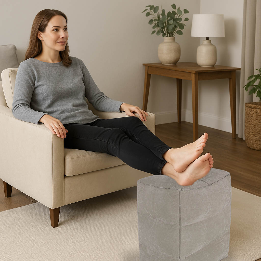Lekka konstrukcja sprawia, że dmuchana pufa może być wykorzystana w dowolnym miejscu: jako podnóżek, siedzenie dodatkowe albo kompaktowy mebel do zabrania w podróż. To rozwiązanie, które łączy mobilność i wygodę z elegancją.