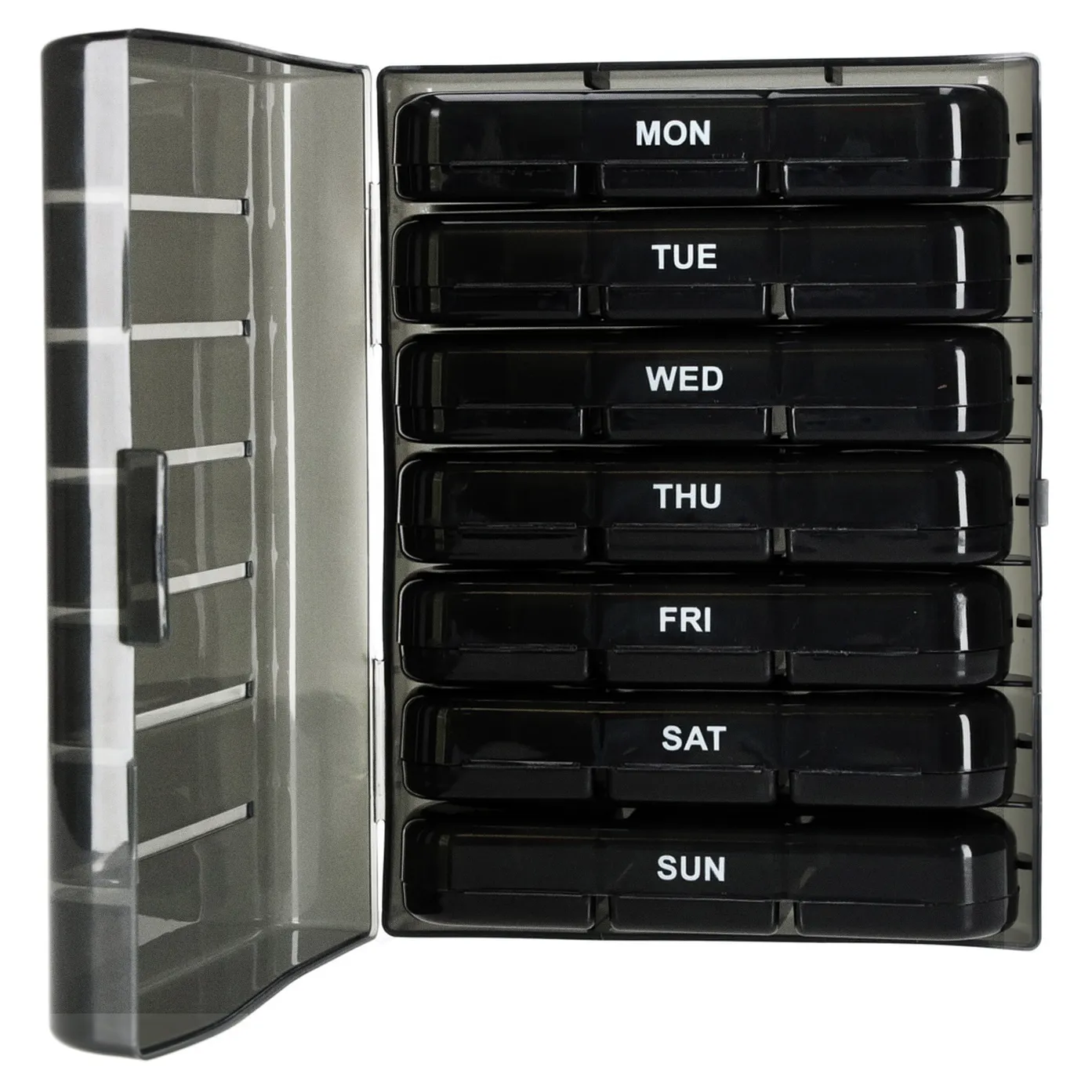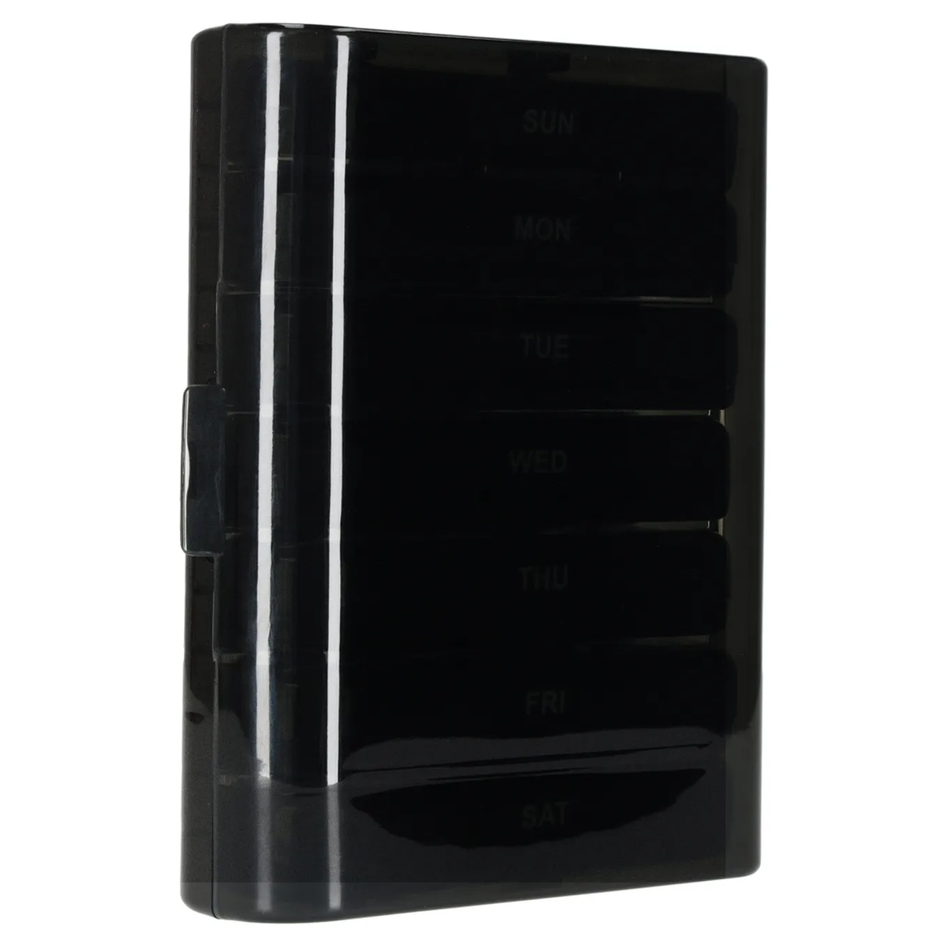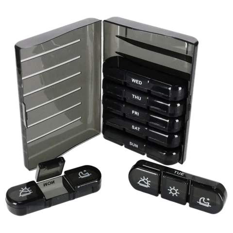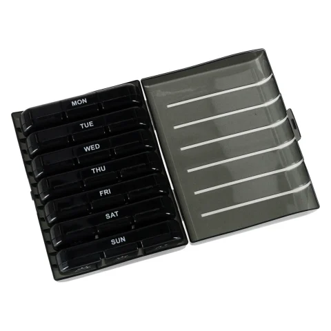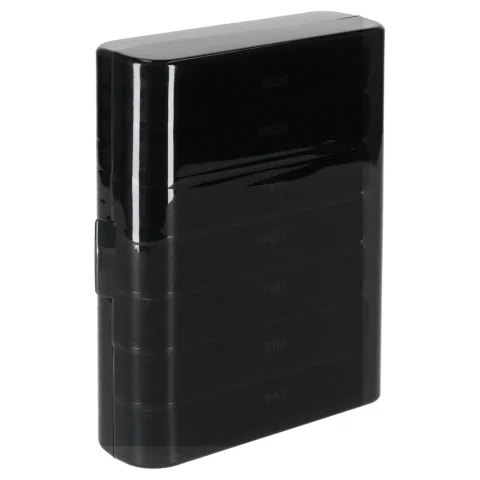 Nowoczesny pojemnik na leki z zamykanymi przegródkami pomaga w codziennym planowaniu przyjmowania leków i suplementów diety. Wyposażony w 7 mini pojemników z oznaczeniami dni tygodnia i pór dnia (rano, południe, wieczór), umożliwia regularne przyjmowanie leków bez ryzyka pomyłki.