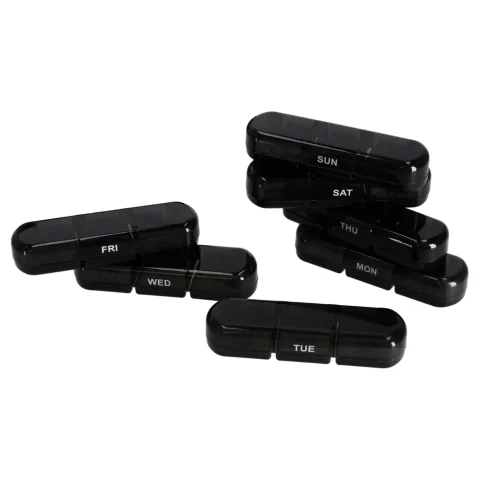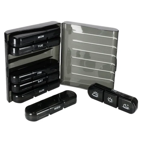 Tygodniowy pojemnik na leki z 7 wyjmowanymi mini kasetkami. Wykonany z trwałego tworzywa PP, odporny na wilgoć i uszkodzenia. Każda przegródka oznaczona dniem i porą dnia. Kompaktowy, lekki, idealny do bezpiecznego przechowywania leków i suplementów.