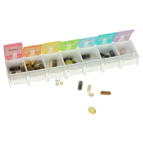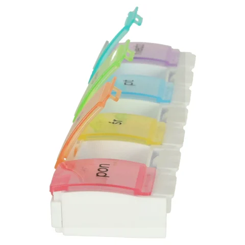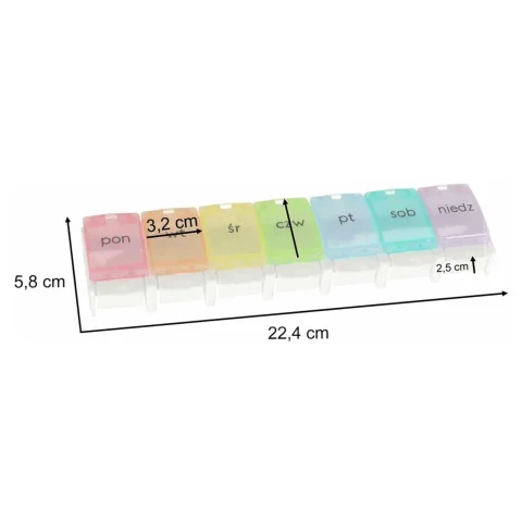 Każda z przegródek jest podpisana po polsku, a poszczególnym dniom tygodnia został przypisany inny kolor. Włożenie tabletek do tygodniowych kasetek ułatwi ich regularne przyjmowanie!