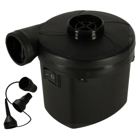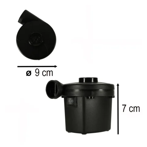 Pompka elektryczna do pompowania materacy oraz akcesoriów basenowych. Również możliwość spuszczania powietrza. W zestawie trzy końcówki. Możliwość podłączenia do gniazda sieciowego (240 V) oraz samochodowego (12 V). Wymiary: 9 cm x 7cm.