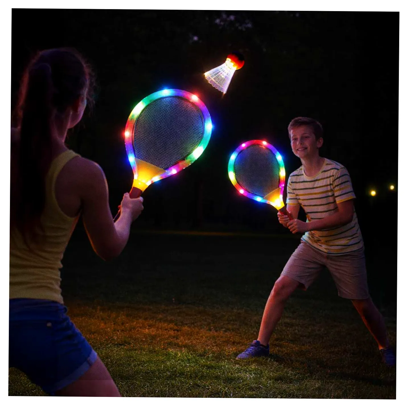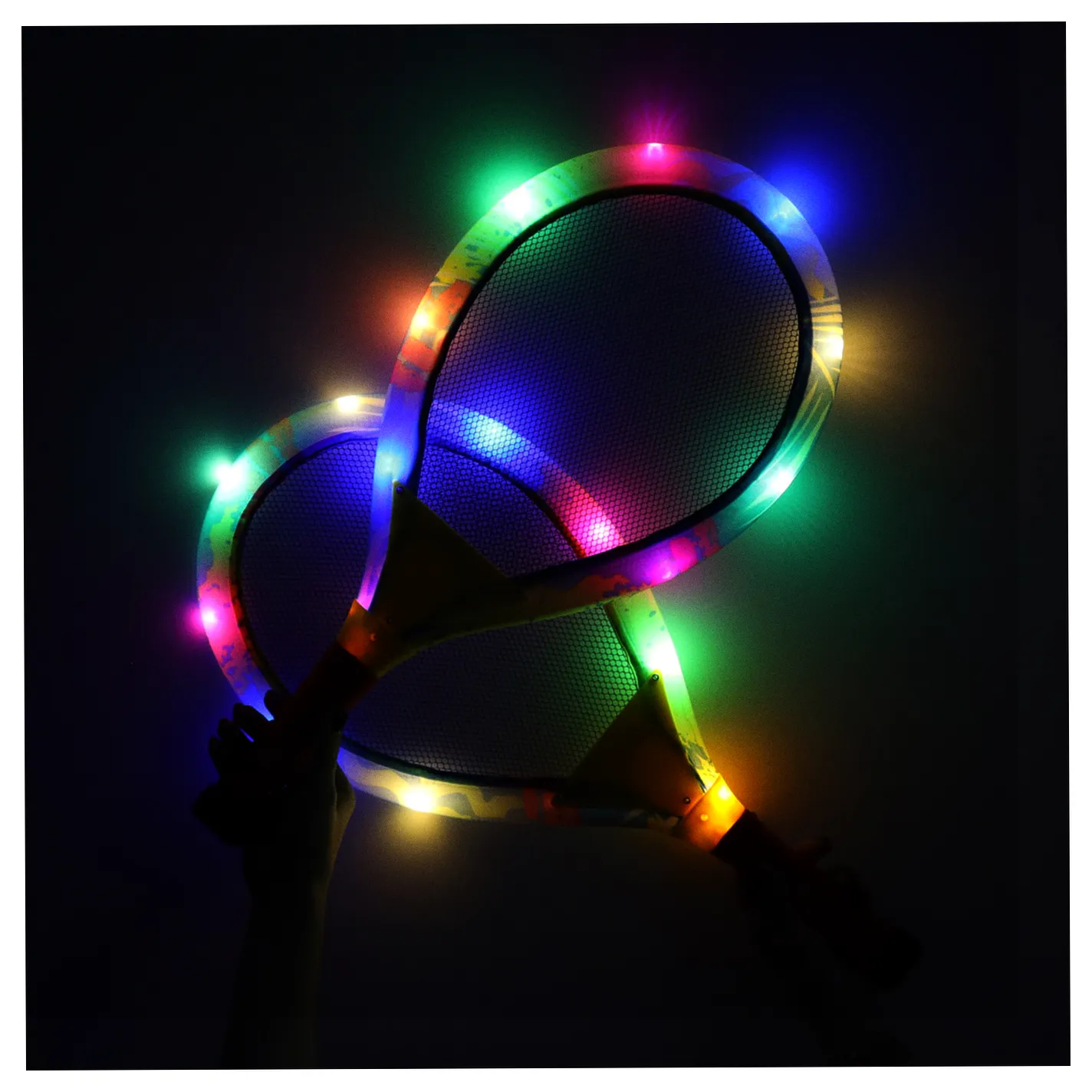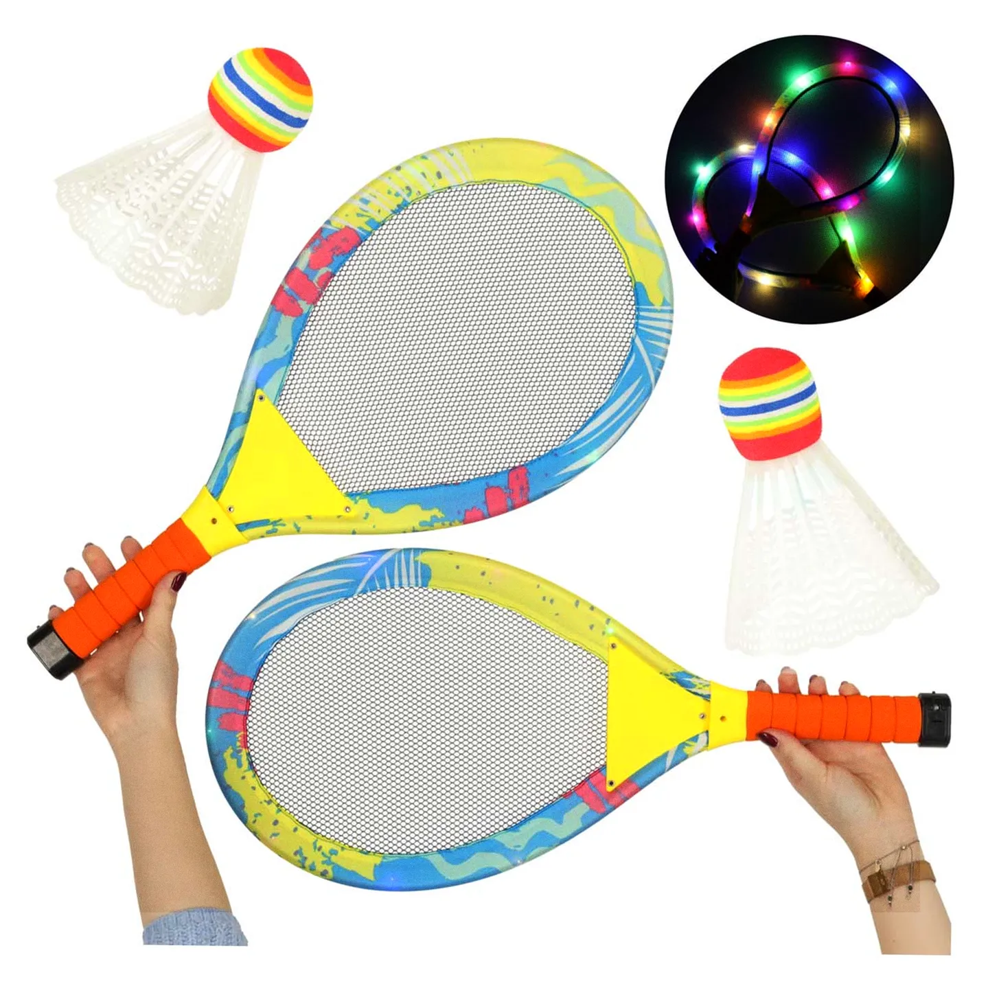 Produkt „RAKIETY TENISOWE ŚWIECĄCE LED + LOTKI” wyróżnia się tym, iż rakiety są podświetlane diodami LED. Rozgrywka po zmroku jest niesamowitym przeżyciem.