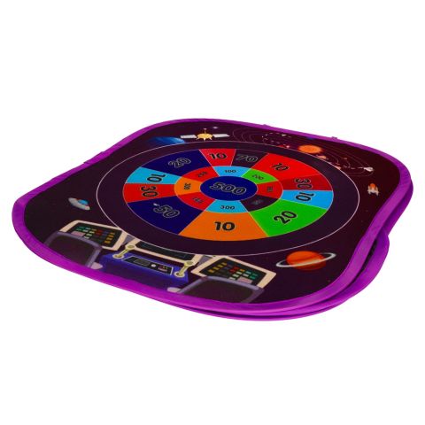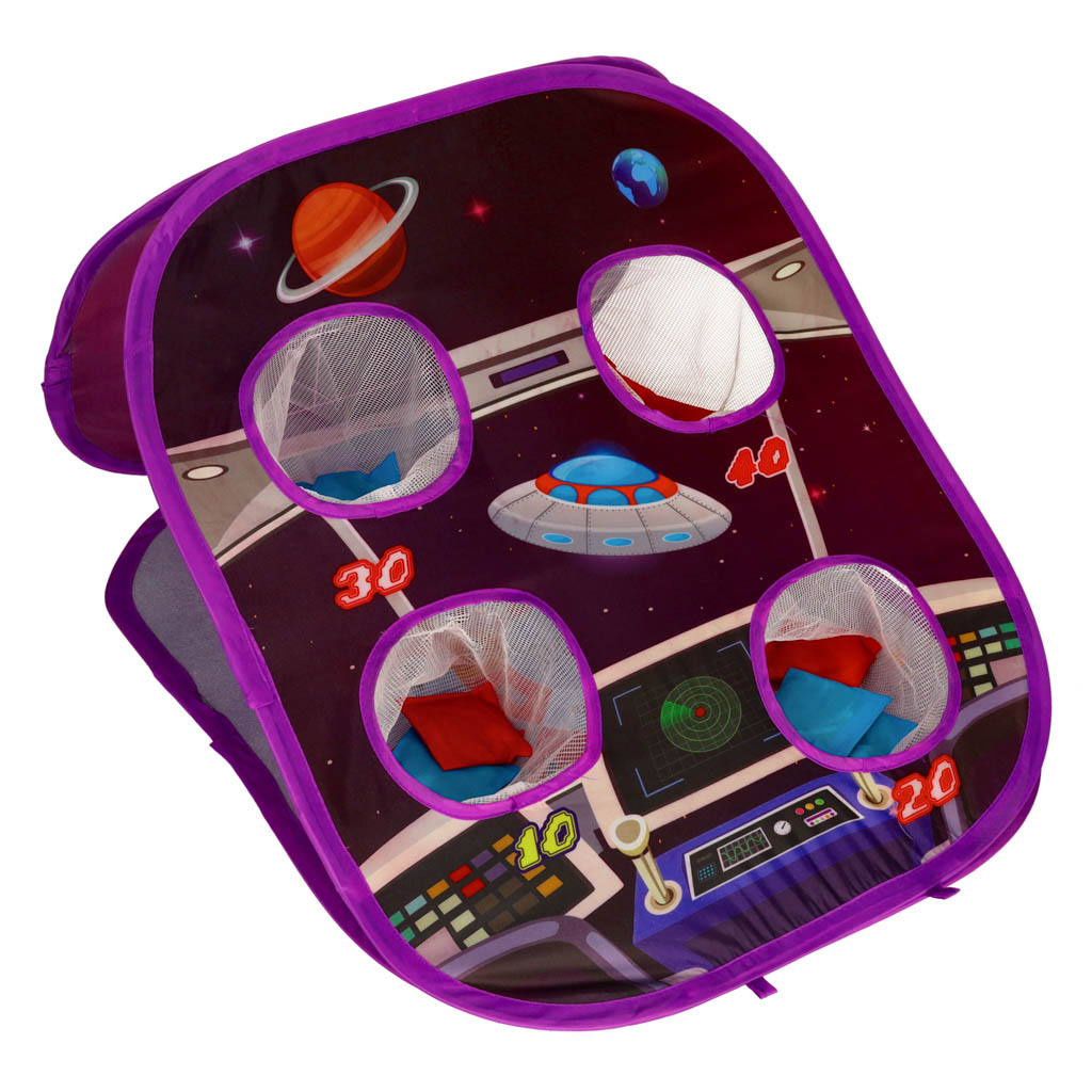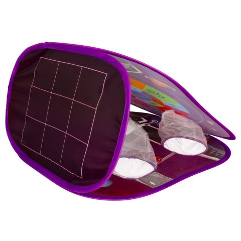Dwustronny, wolnostojący cel, mocowany przy użyciu plastikowych śledzi, pozwoli zorganizować zawody w rzucaniu w dowolnym miejscu, zarówno w domu, jak i na podwórku! Jedna z jego ścian przedstawia okrągłą tarczę z punktacją, do której z łatwością czepiać się będą znajdujące się w zestawie kulki z rzepami. Druga ze ścian posiada 4 otwory, w które należy trafić woreczkiem.