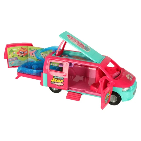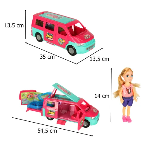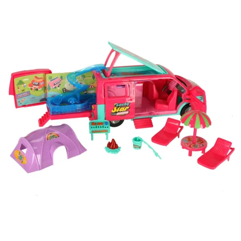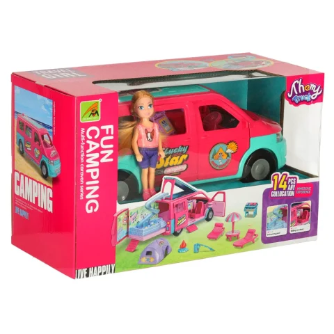 Samochód kamper rozkładany kempingowy z uroczą laleczką i akcesoriami tworzy mobilny mini-kemping pełen atrakcji. Otwierane drzwiczki, namiot, basen i zjeżdżalnia gwarantują kreatywną zabawę i małe podróże pełne przygód.