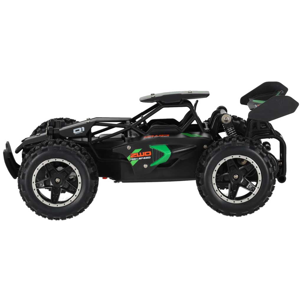 Zdalnie sterowane szybkie auto zasilane na ładowany akumulator. Rozpędza się do prędkości aż 18 km/h – koła z bieżnikami umożliwiają jazdę po nierównym i kamienistym terenie. Dla dzieci od 6 lat. Wymiary: 23 cm x 15 cm x 9 cm