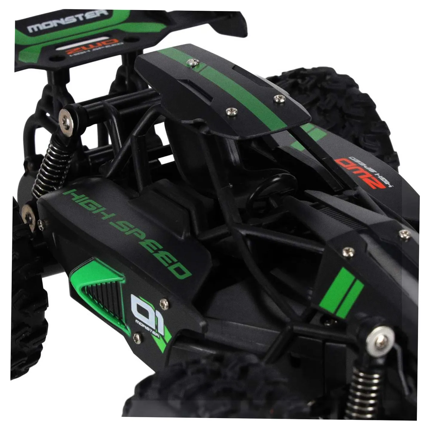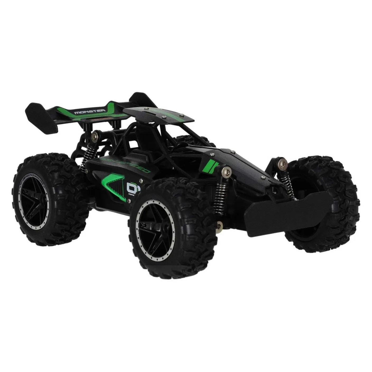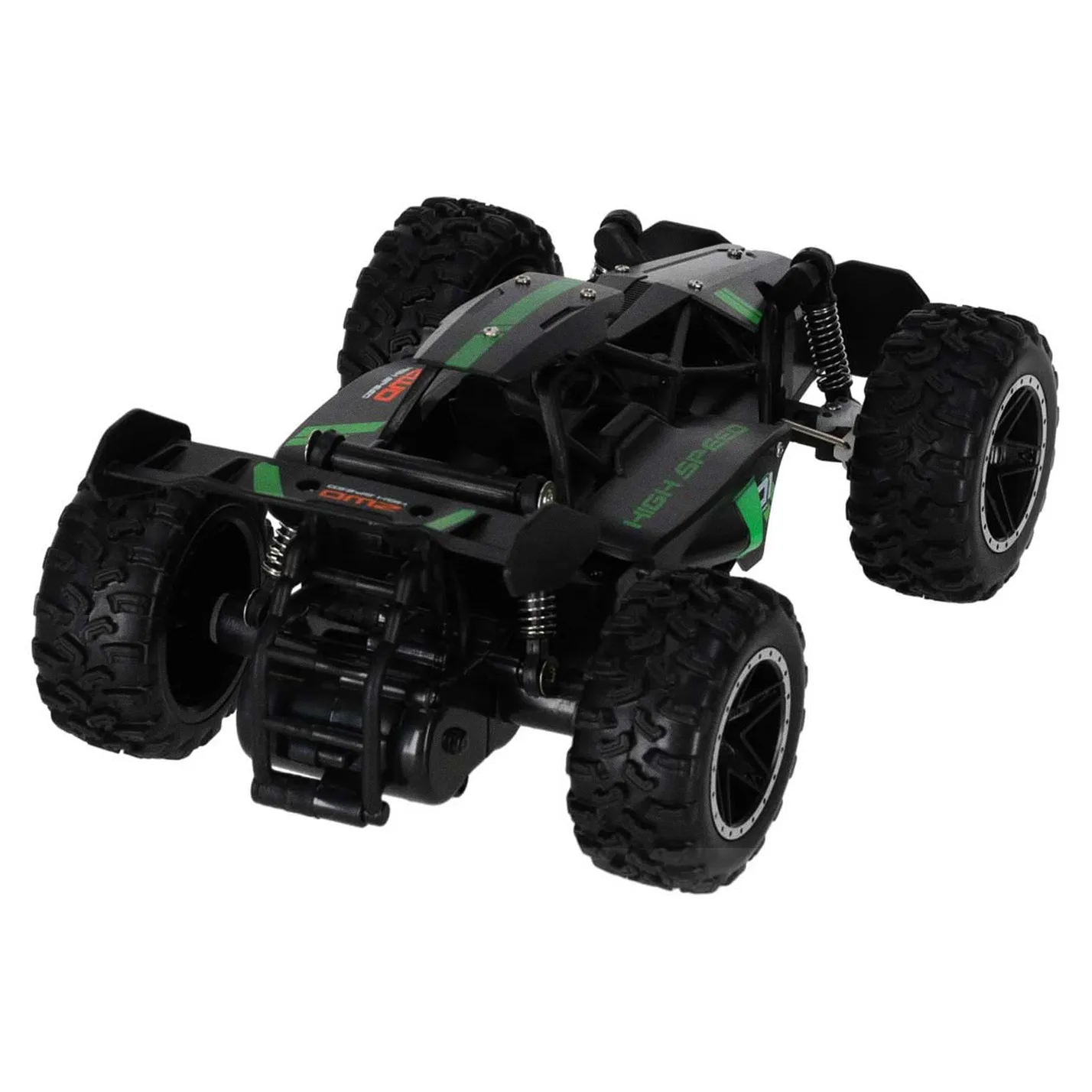 Model RC płynnie porusza się po nierównym i kamienistym podłożu. To zasługa dużych kół z bieżnikami oraz sprężynowych amortyzatorów. Dzięki nim auto bez problemu pokonuje przeszkody na drodze.