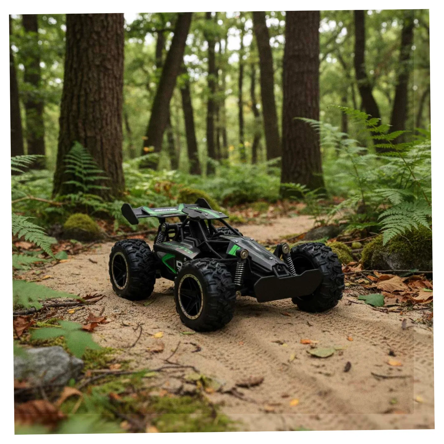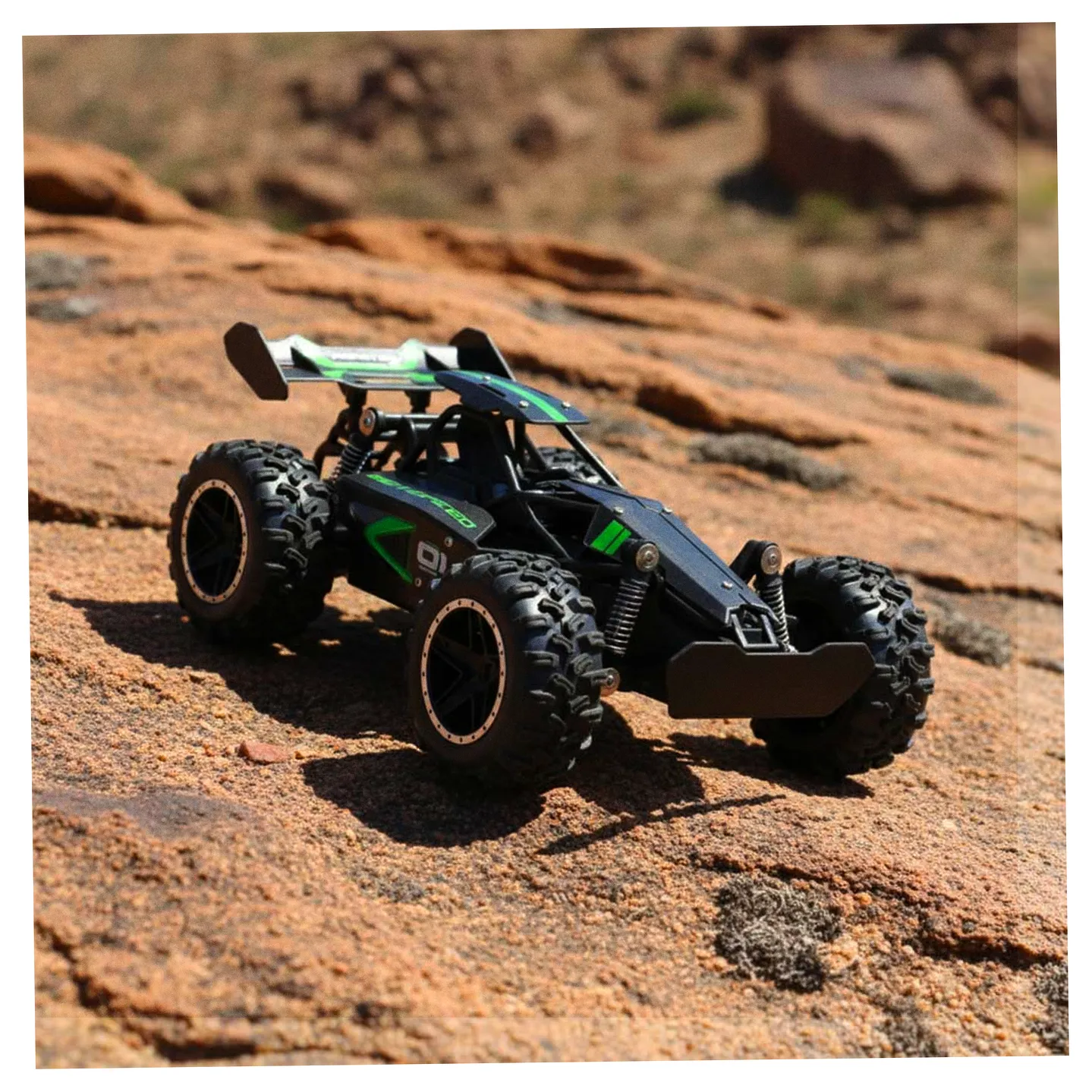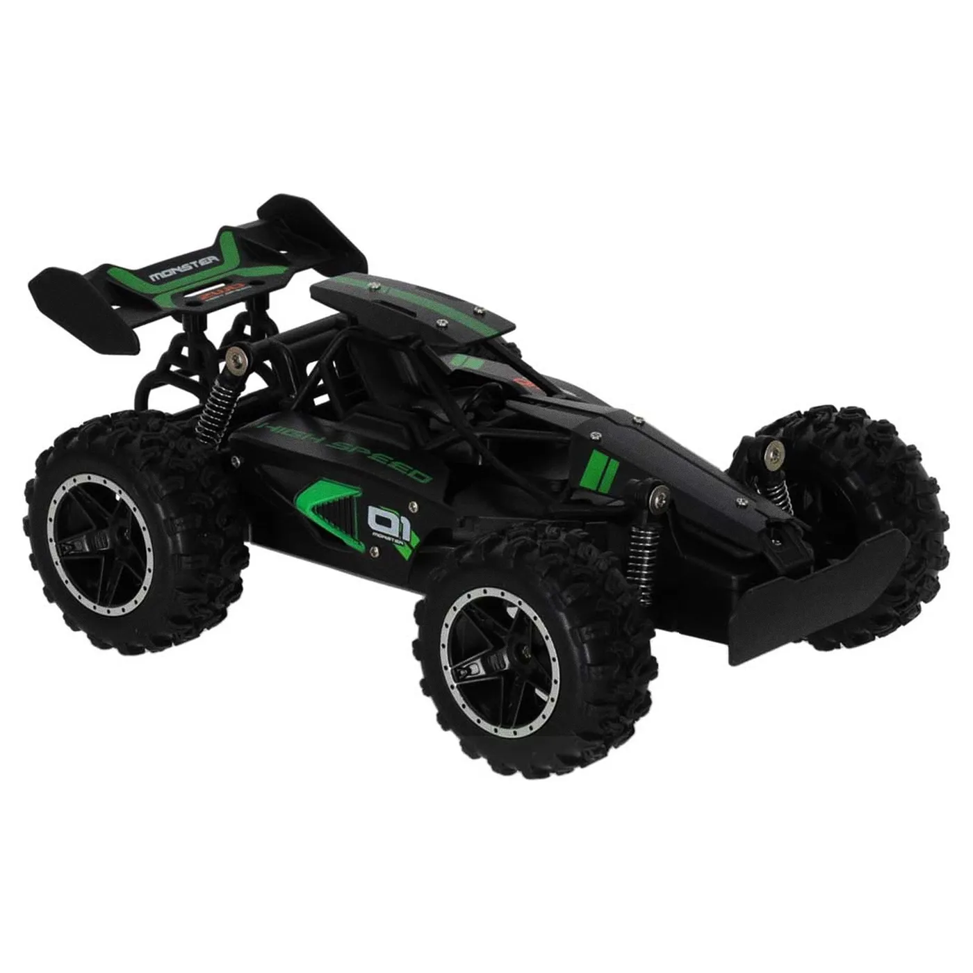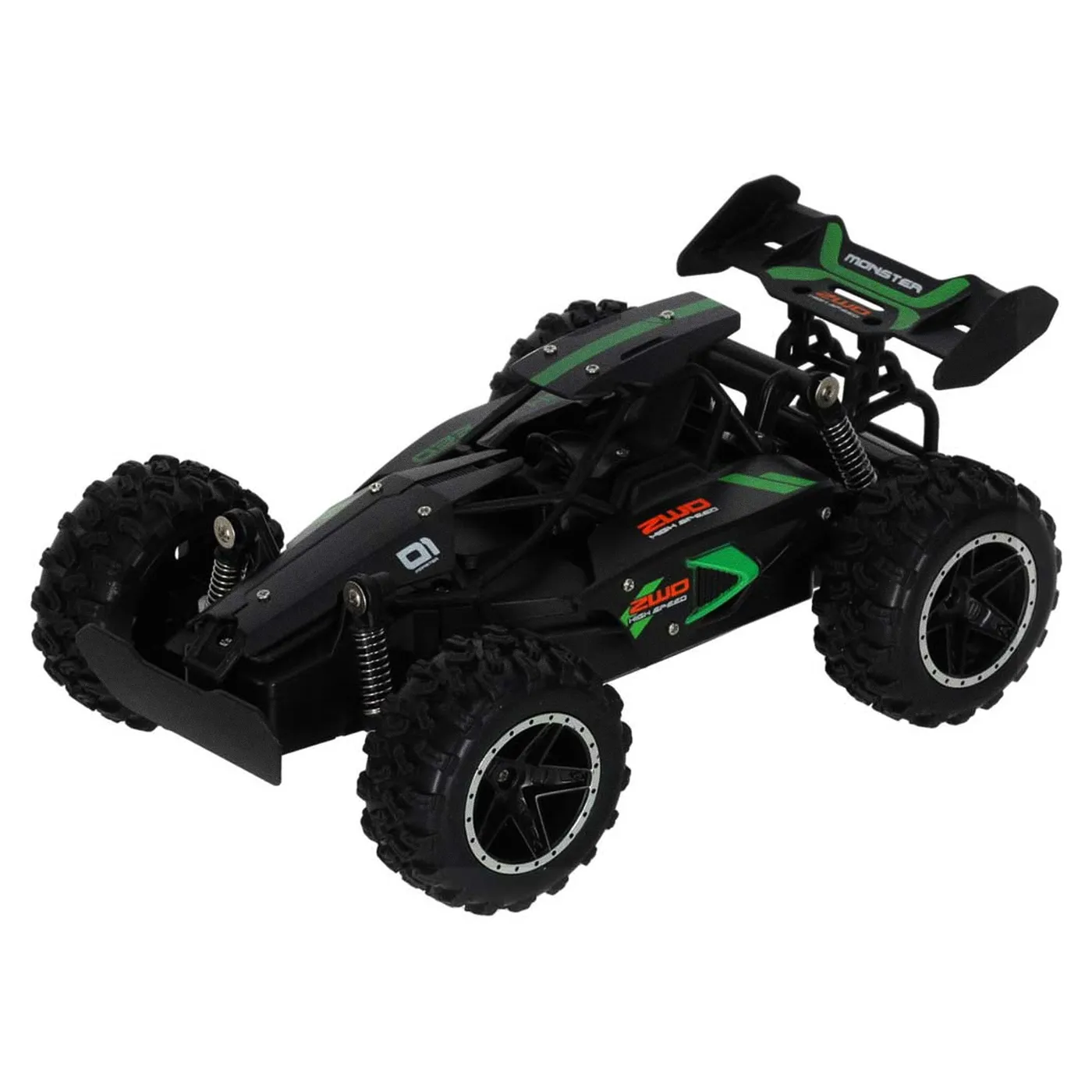 Model RC płynnie porusza się po nierównym i kamienistym podłożu. To zasługa dużych kół z bieżnikami oraz sprężynowych amortyzatorów. Dzięki nim auto bez problemu pokonuje przeszkody na drodze.