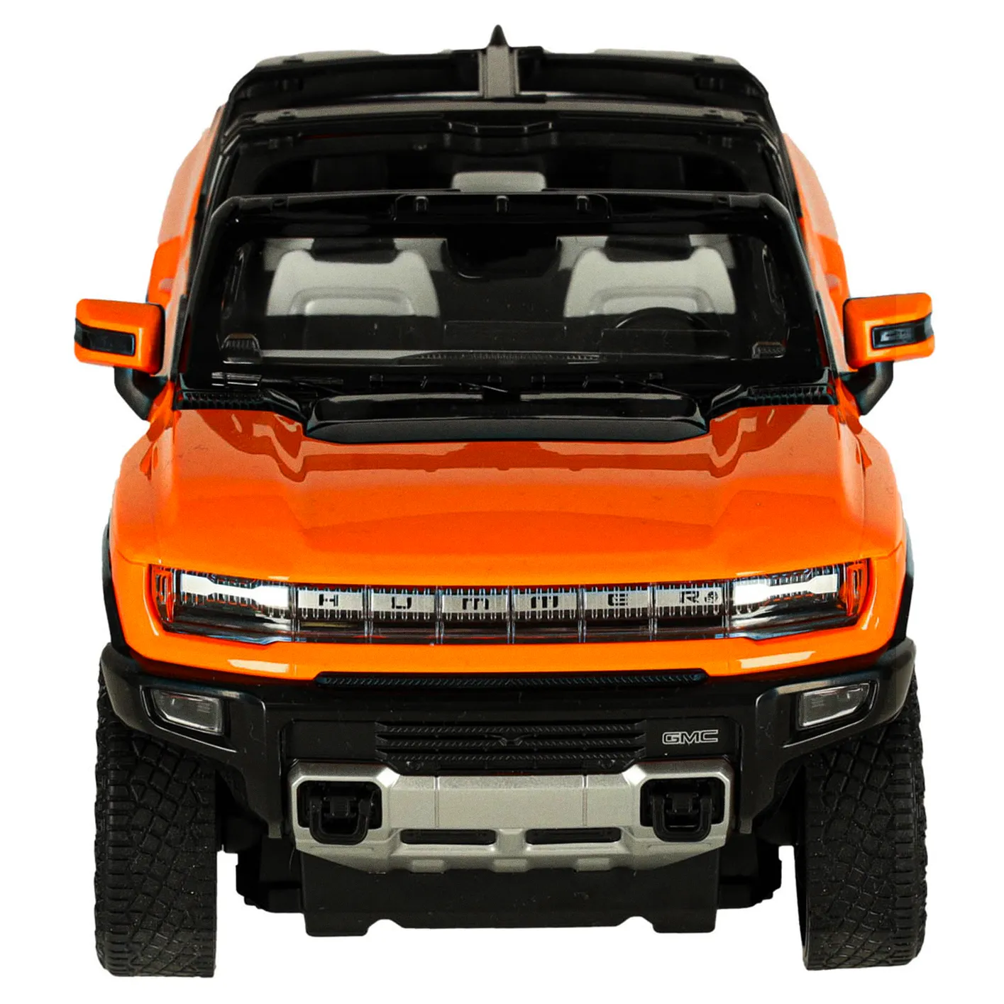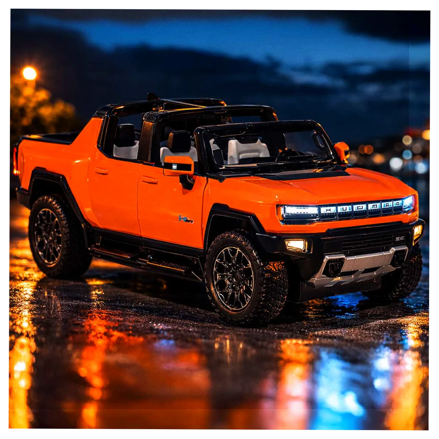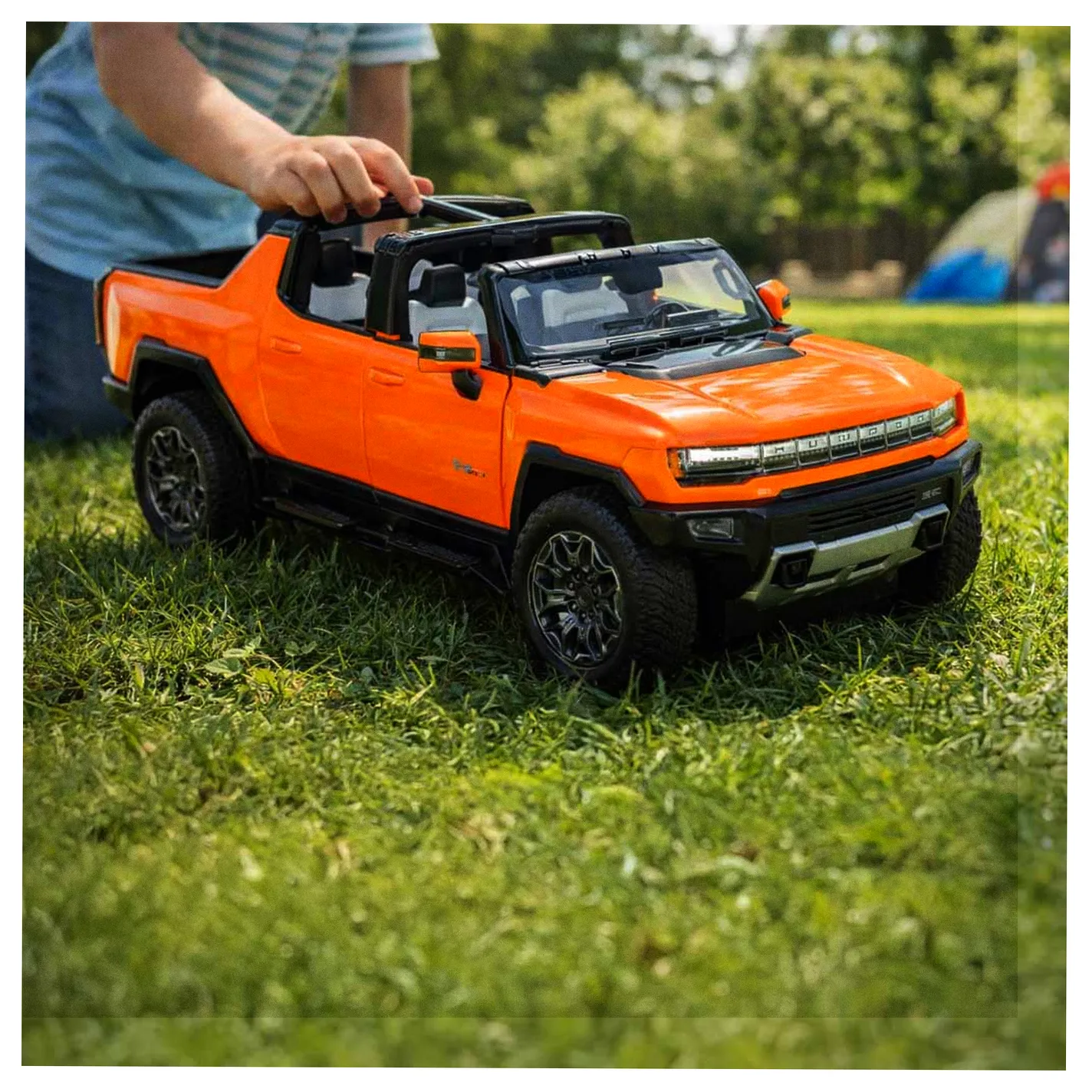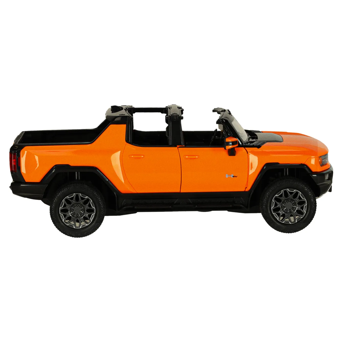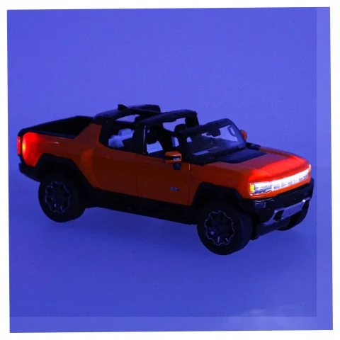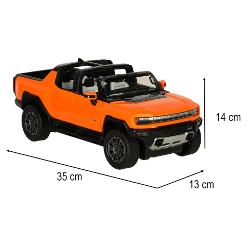 Pomarańczowy Hummer EV przyciąga wzrok swoim nowoczesnym wyglądem, który wiernie odtwarza detale prawdziwego pojazdu. Aerodynamiczna sylwetka, solidne wykończenie i logo Hummera sprawiają, że model wygląda realistycznie.