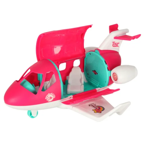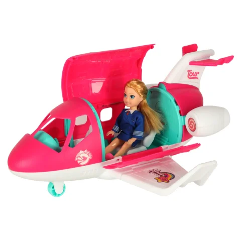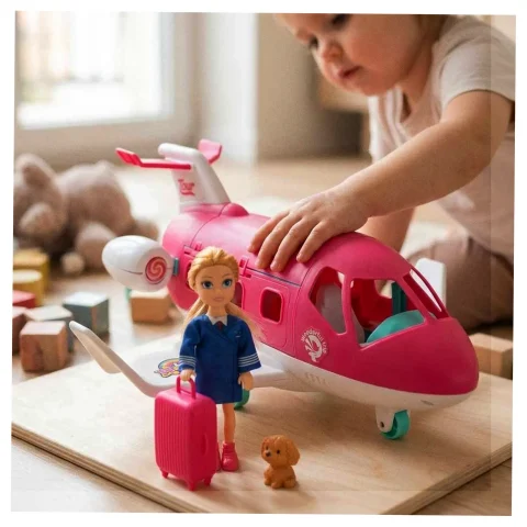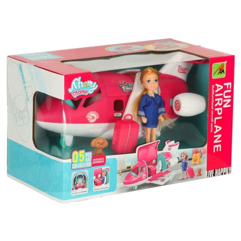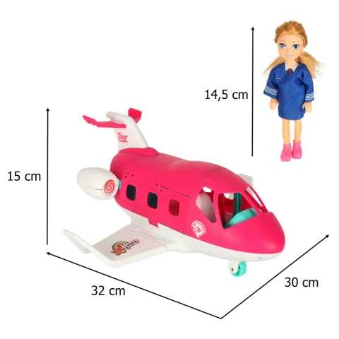 Różowy rozkładany samolot z lalką-stewardessą zabierze dziecko w świat dalekich podróży. Weź ze sobą pieska, spakuj walizkę i w drogę! Zabawa samolotem będzie pretekstem do poznawania krajów świata. Wymiary samolotu: 32 cm x 30 cm x 15 cm