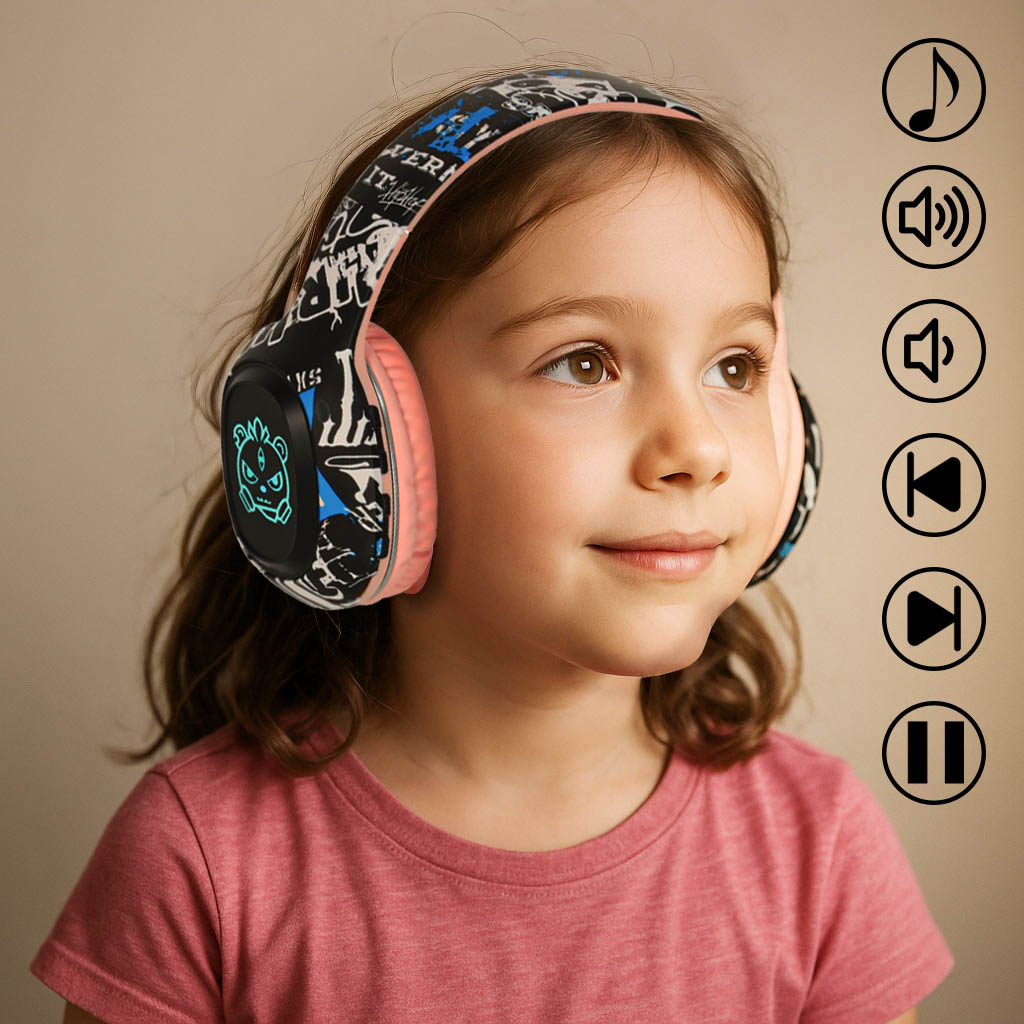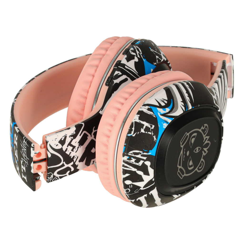 Słuchawki nauszne z łączem Bluetooth, wejściem jack i kartę micro SD. Wyróżnia je kolorowa obudowa oraz podświetlenie RGB. Za pomocą przycisków można dowolnie zmieniać piosenki lub regulować głośność. Wymiary: 17,5 cm x 20 cm x 9 cm, kolor: różowy