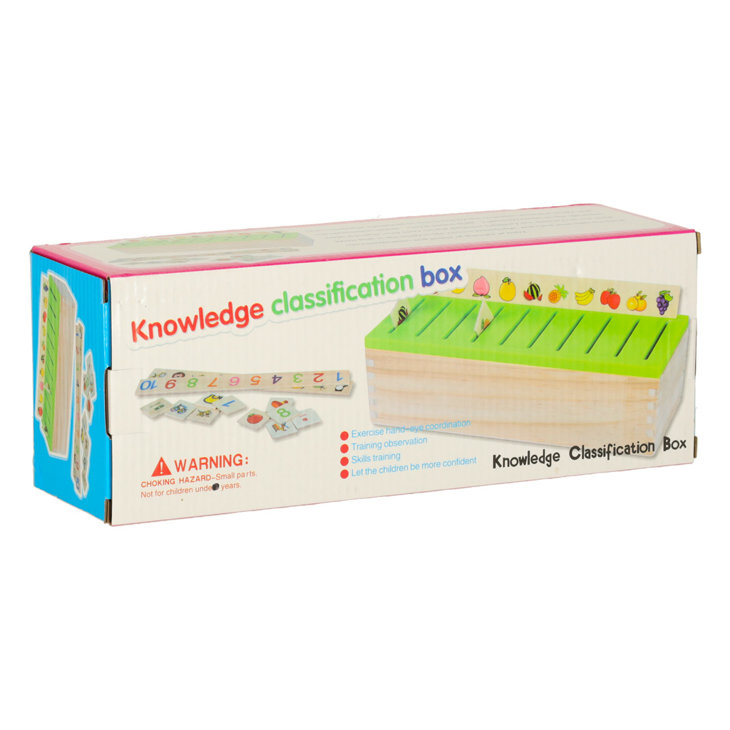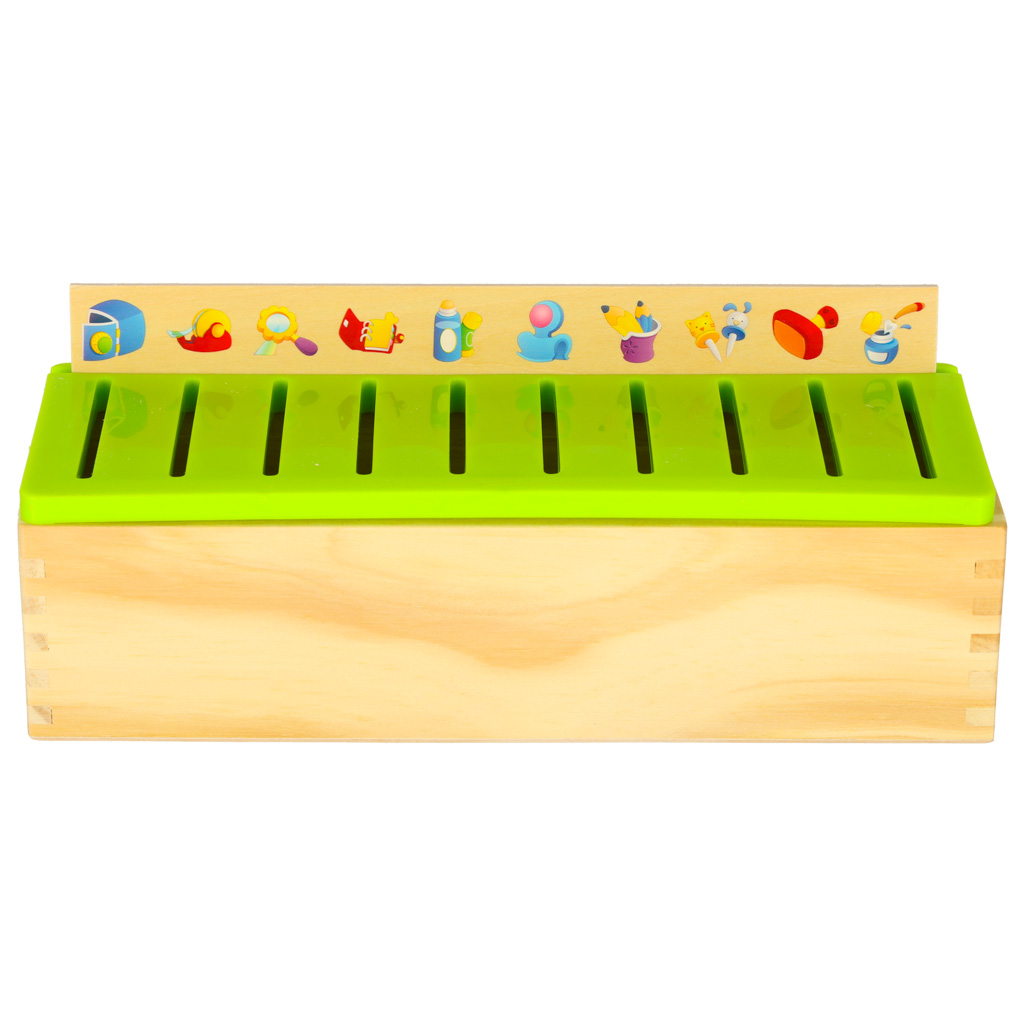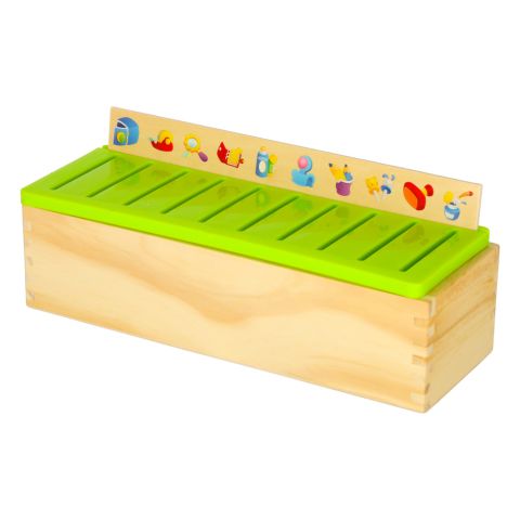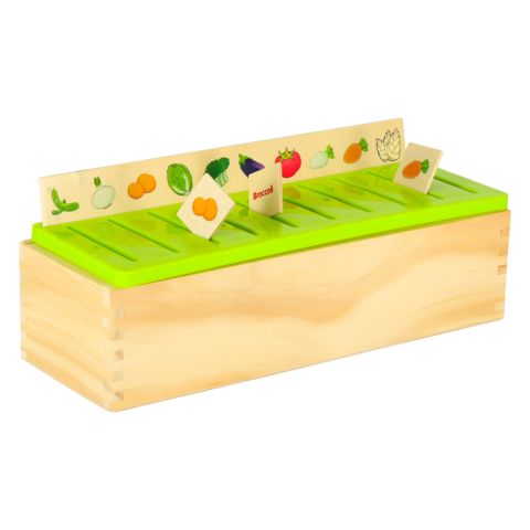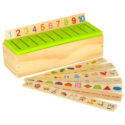 Edukacyjny sorter-układanka w postaci drewnianej skrzyneczki. Polega na dopasowaniu obrazka i włożeniu go do otworu. Zabawa pozwoli poznać słowa w języku angielskim. W zestawie: skrzyneczka oraz dwa rodzaje tabliczek z obrazkami. Wymiary: 28x10x8cm.