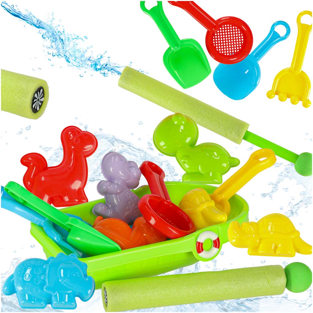 Zestaw do piaskownicy: foremki do piasku (6 szt.), łódka (24×14,5×7 cm), pistolet na wodę (21-38×3 cm), sitko, grabki (14,5 cm), 2 łopatki. Zabawki do piasku dla dzieci, do zabawy w piaskownicy, ogrodzie, wodzie, na plaży.