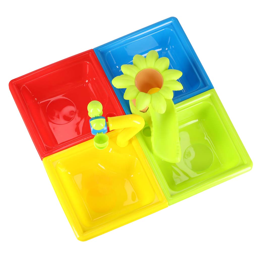 Zestaw zawiera stolik z sekcjami na piasek i wodę oraz bogaty pakiet dodatków. Zestaw zawiera akcesoria, które umożliwiają zabawę w różnorodny sposób – od kopania i przesypywania, po przelewanie i sterowanie kierunkiem wody.
