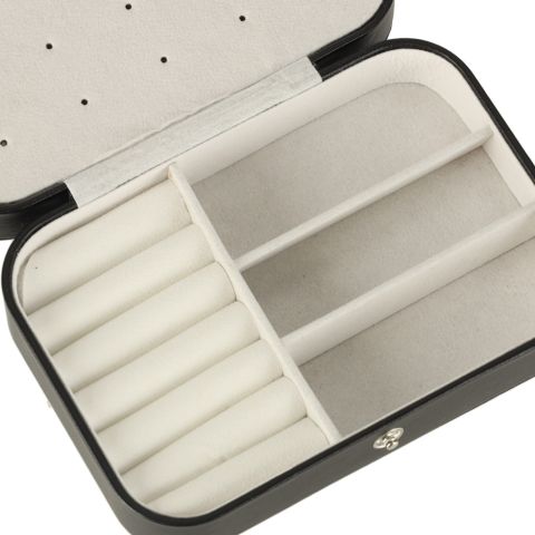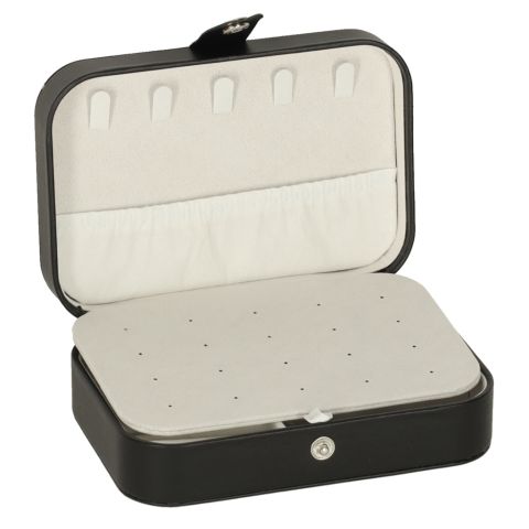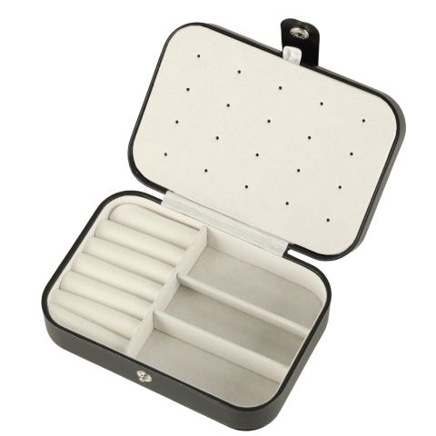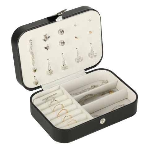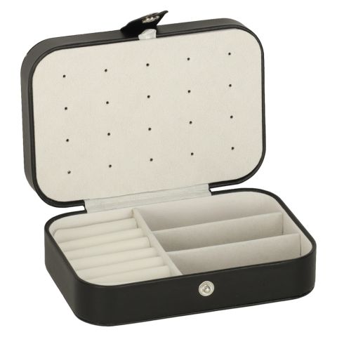 To stylowa kasetka na biżuterię w eleganckiej, klasycznej czerni z kontrastowym jasnym wnętrzem, która doskonale wpasuje się w wystrój każdej toaletki. To nowoczesna szkatułka, która łączy w sobie kompaktowy rozmiar z imponującą funkcjonalnością i zaskakującą pojemnością. Dzięki przemyślanemu układowi przegródek, haczyków i miejsc na pierścionki oraz kolczyki, pozwala wygodnie przechowywać różne elementy biżuterii, zapewniając jednocześnie bezpieczne przechowywanie nawet większej kolekcji dodatków. Idealny wybór dla miłośniczek biżuterii, które chcą połączyć styl, nowoczesny design i praktyczne rozwiązania w jednym organizerze.
