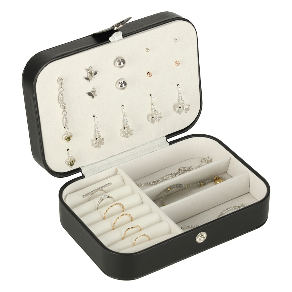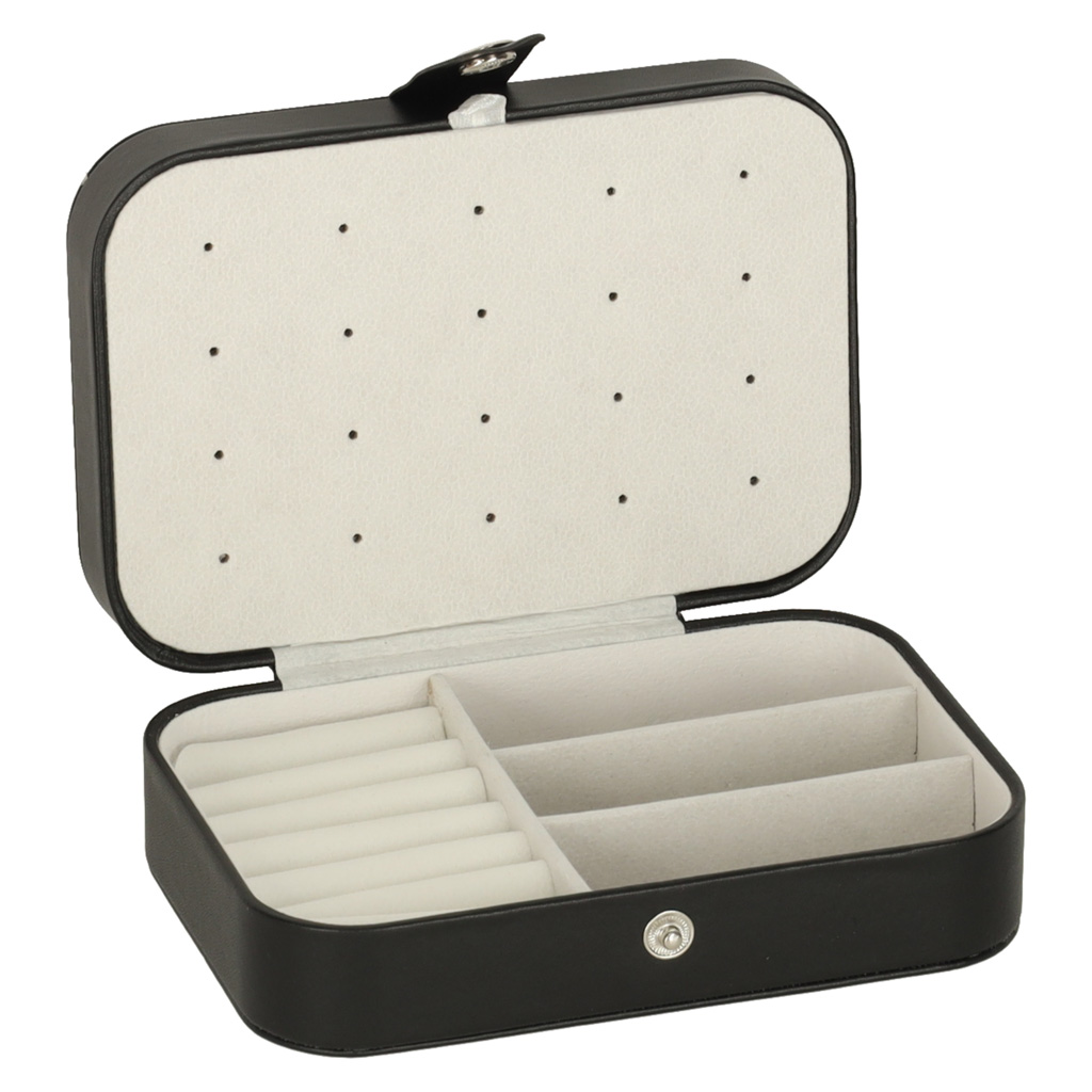 Ta stylowa szkatułka sprawdzi się zarówno w domu, jak i w podróży. Praktyczny zatrzask zapewnia bezpieczne przechowywanie, a wysokiej jakości materiał zapewnia biżuterii odpowiednią ochronę. Pozwól swojej biżuterii lśnić i ciesz się idealnym porządkiem każdego dnia.