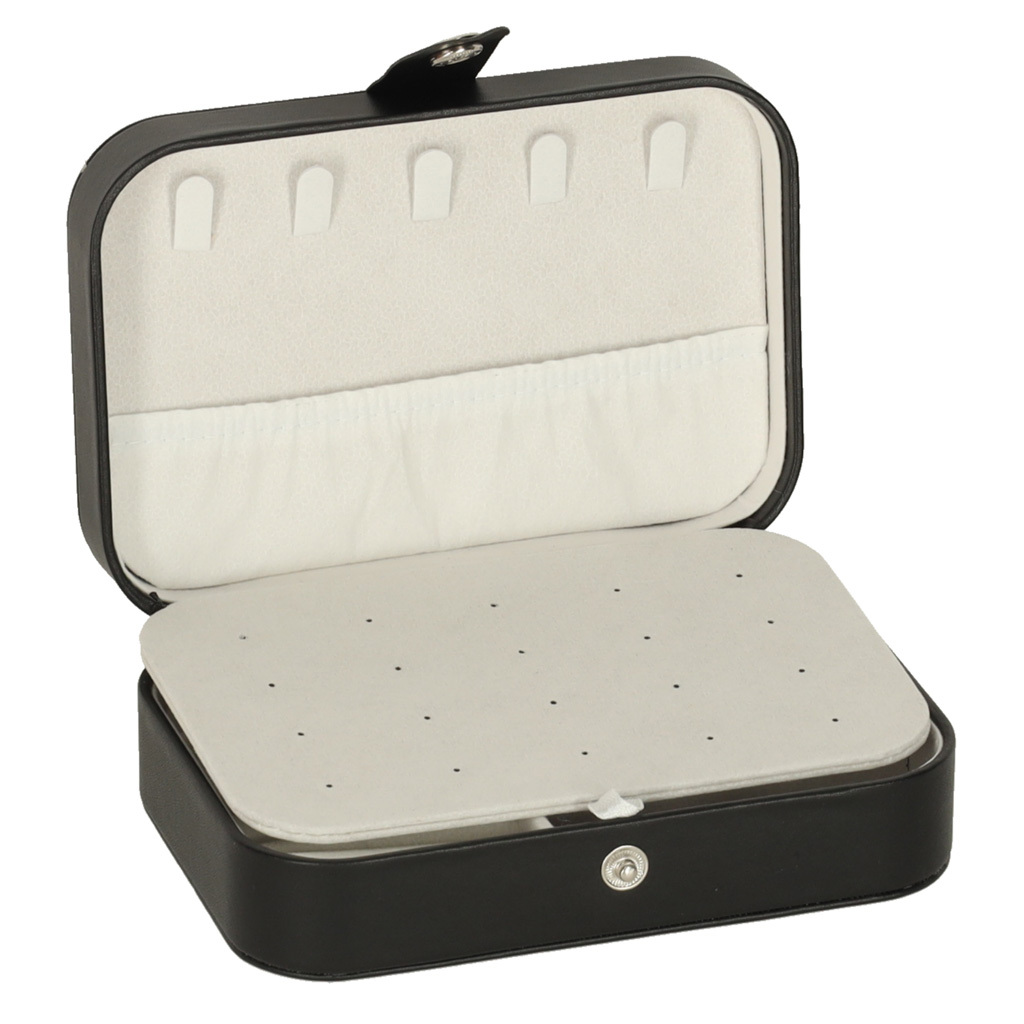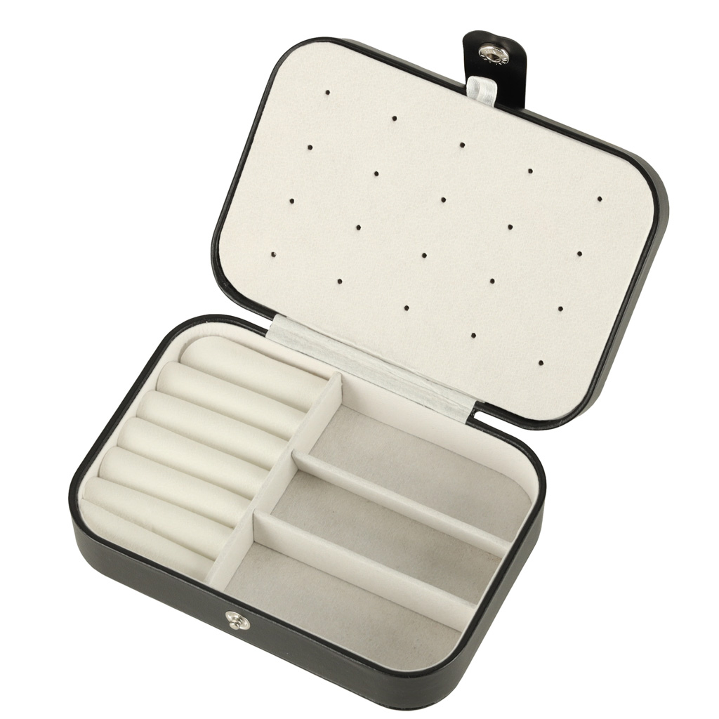Elegancka szkatułka na biżuterię z zatrzaskiem i dwoma przegrodami. Posiada 12 miejsc na pierścionki, uchwyty na 10 par kolczyków oraz 5 haczyków z kieszonką na naszyjniki. Kompaktowa (16×11×5 cm), idealna do uporządkowanego przechowywania biżuterii