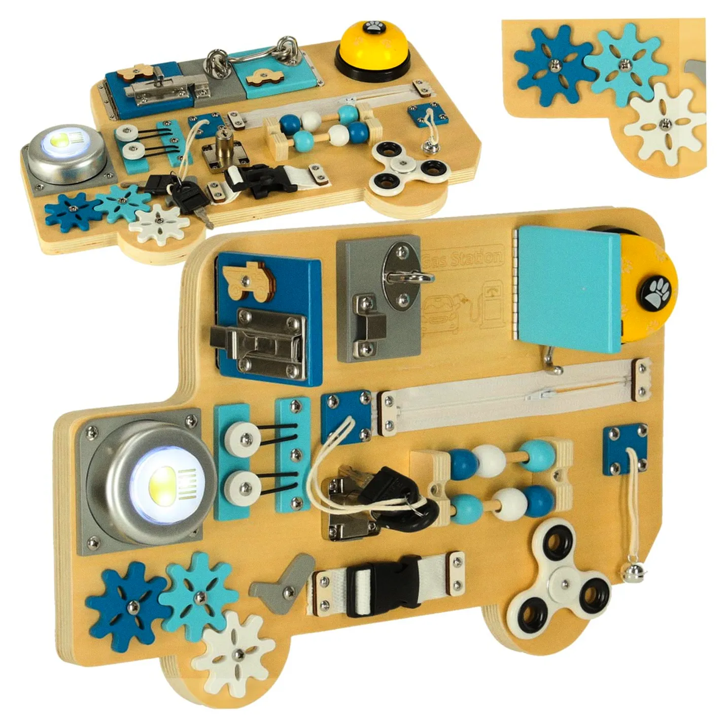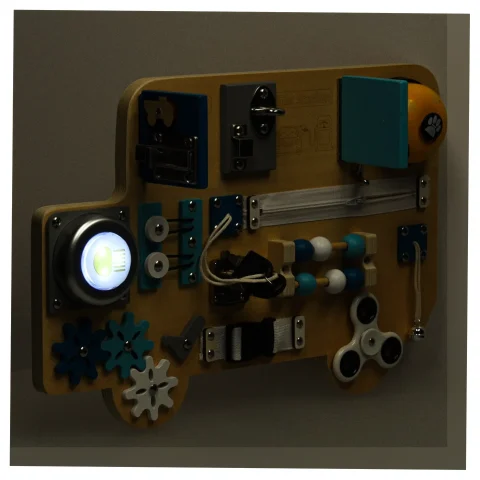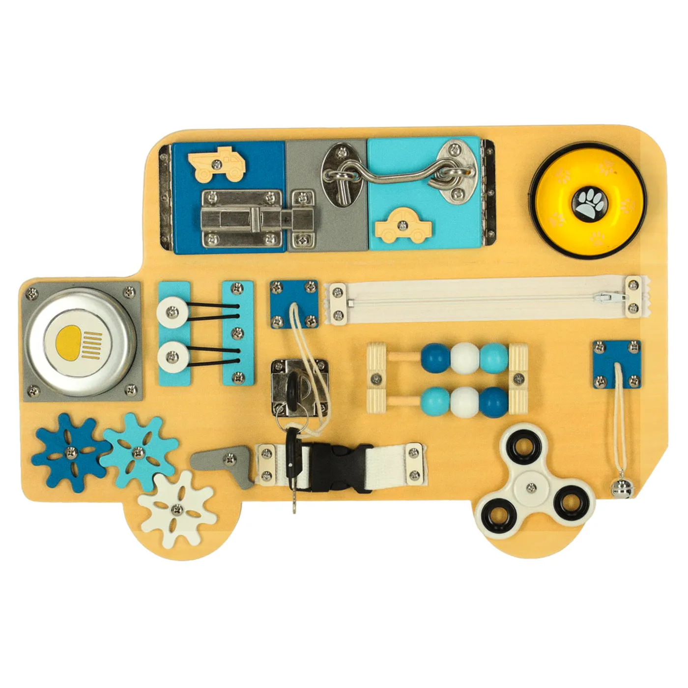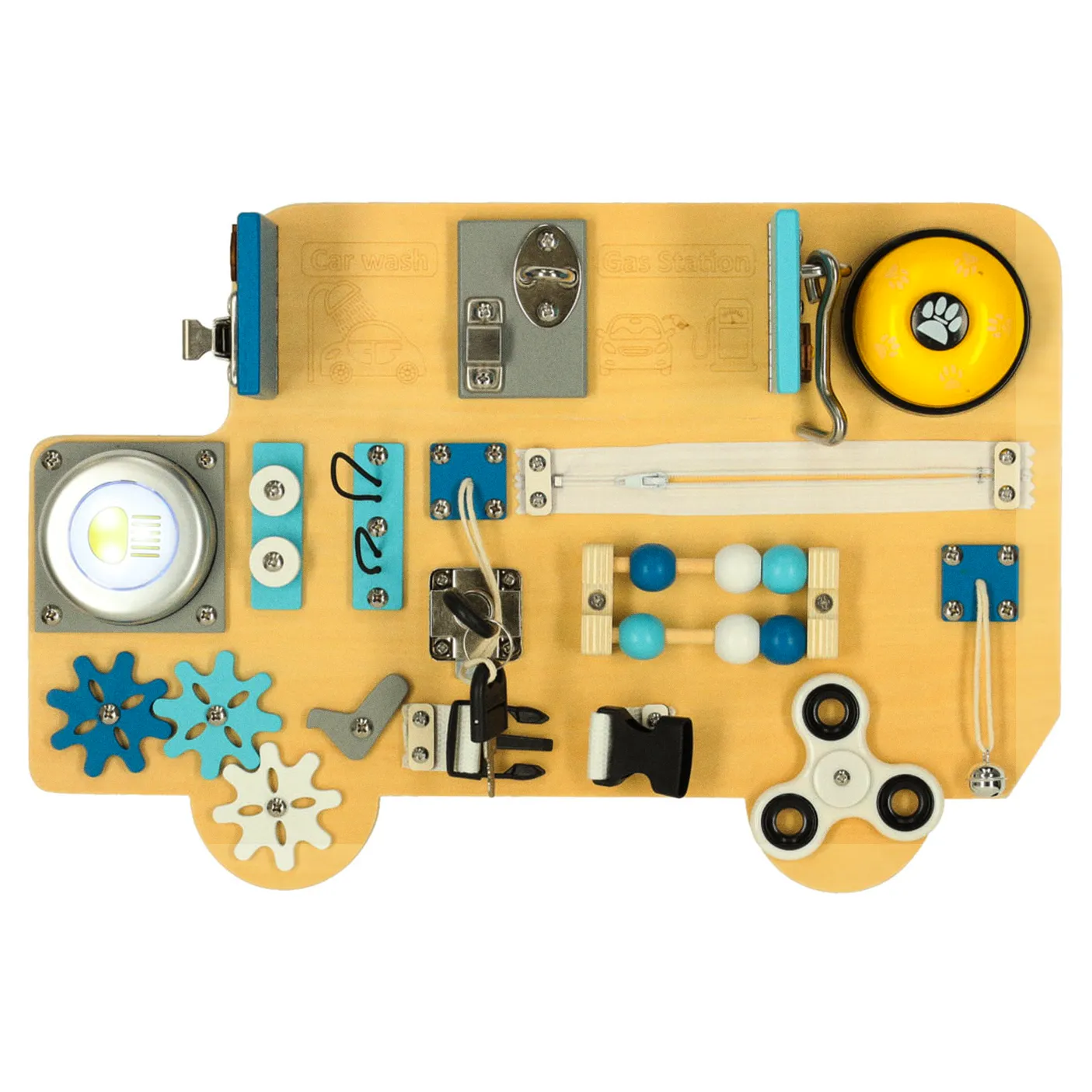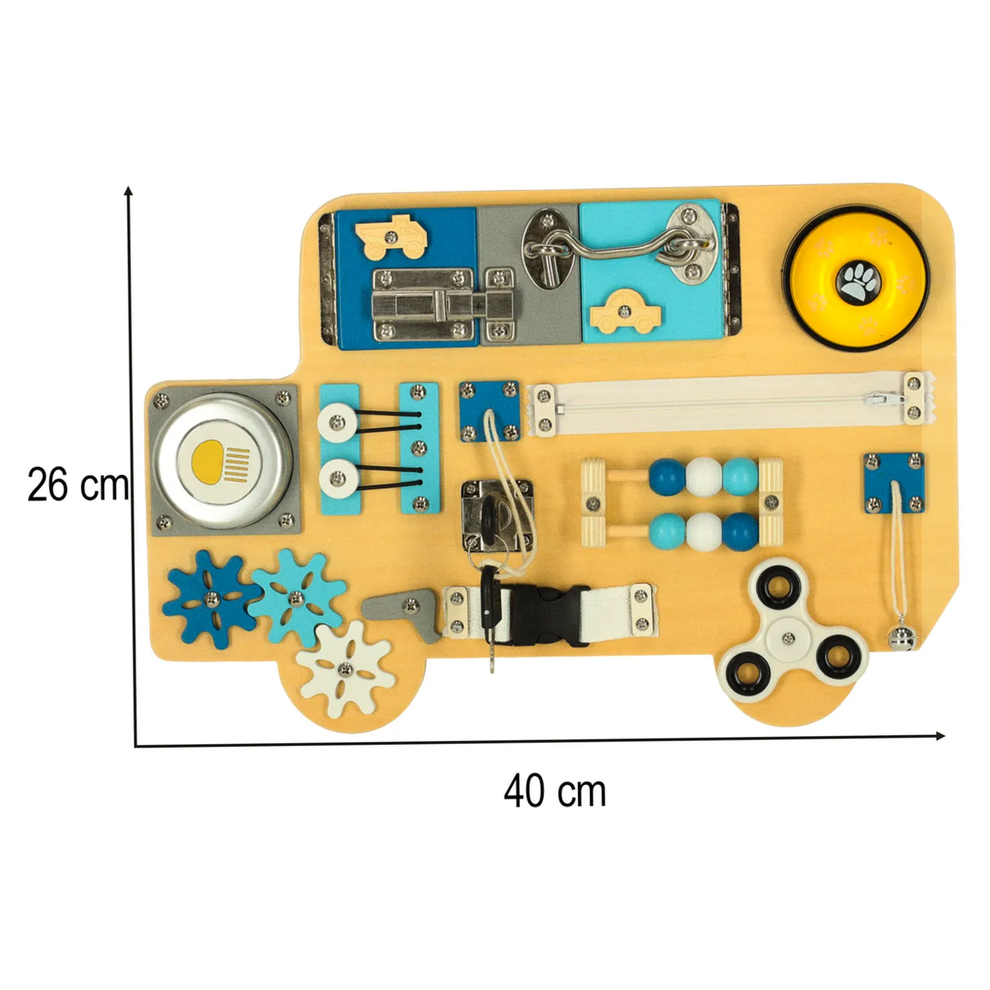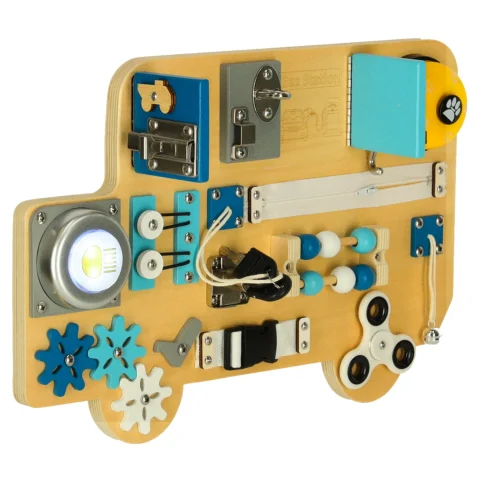 Ta tablica jest w kształcie autobusu, co z pewnością spodoba się każdemu miłośnikowi pojazdów. Elementy sensoryczne również nawiązują do motoryzacji – maluch znajdzie na tablicy drewniane autka, a także ukryte pod kolorowymi kwadratami rysunki stacji benzynowej i myjni samochodowej.