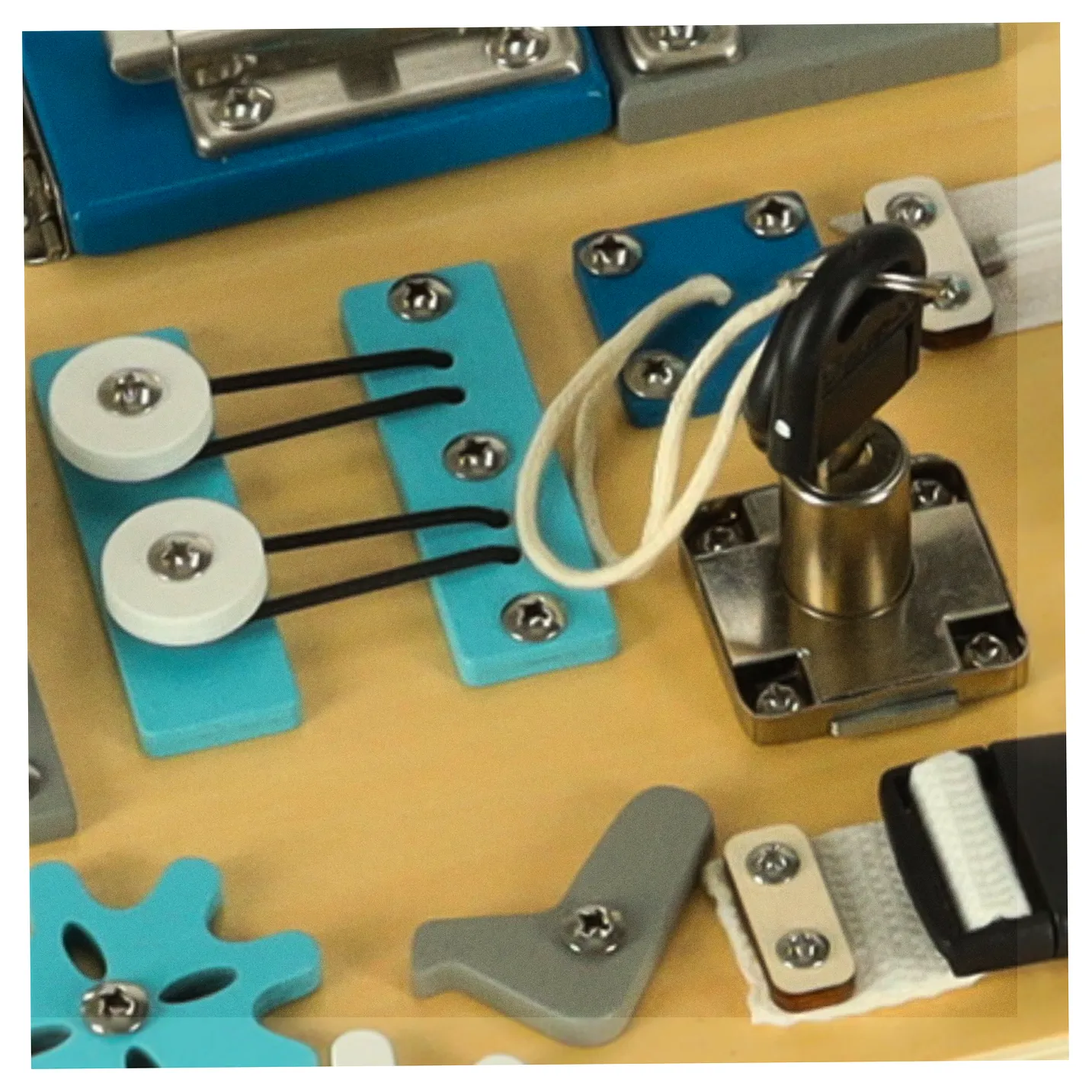 Podczas zabawy tablicą maluch będzie mógł przesuwać, wciskać, przekręcać i otwierać wszystkie elementy, dzięki czemu będzie ciągle rozwijać swoje umiejętności manualne, a także zaspokajać swoją ciekawość.