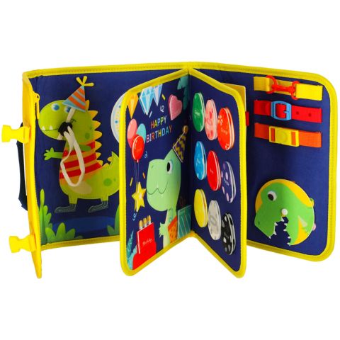 Sensoryczna tablica manipulacyjna z motywem dinozaurów ma w sobie elementy, które przydadzą się do nauki języka obcego, kształtów, kolorów oraz cyfr. Część elementów tablicy posiada napisy w języku angielskim, umożliwiając dziecku przyswajanie oraz utrwalanie słownictwa.