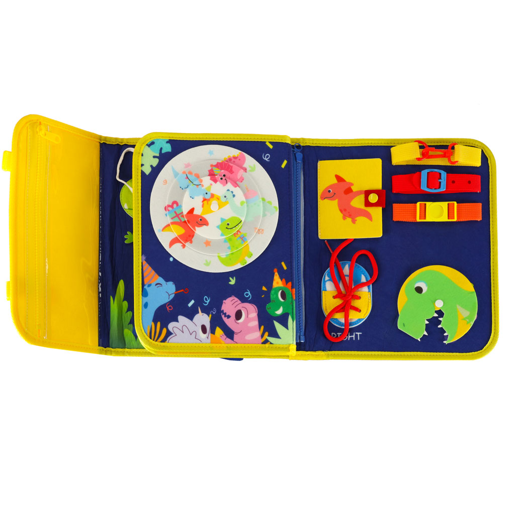 Sensoryczna tablica manipulacyjna z motywem dinozaurów ma w sobie elementy, które przydadzą się do nauki języka obcego, kształtów, kolorów oraz cyfr. Część elementów tablicy posiada napisy w języku angielskim, umożliwiając dziecku przyswajanie oraz utrwalanie słownictwa.