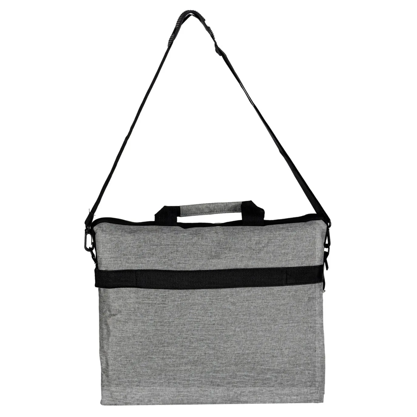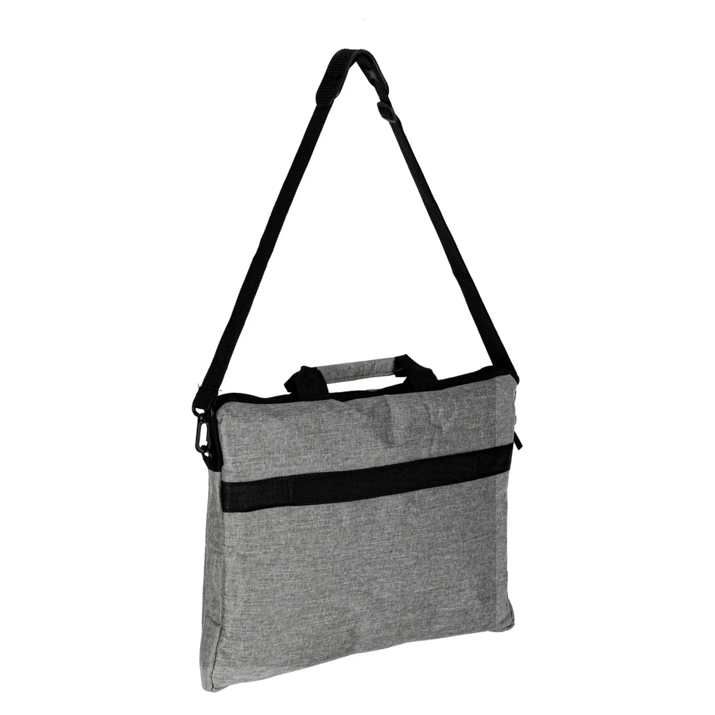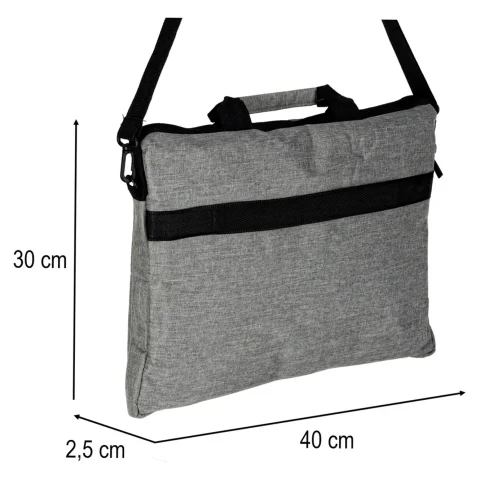 Torba na laptopa 15,6″ wykonana z materiału Oxford 300D odpornego na przetarcia. Wyposażona w odpinany pasek (75-125 cm), tylne mocowanie do walizki i kieszeń na zamek. Grubość ścianek 1 cm z pianką amortyzującą wstrząsy, wymiary zewnętrzne 40×30×2,5