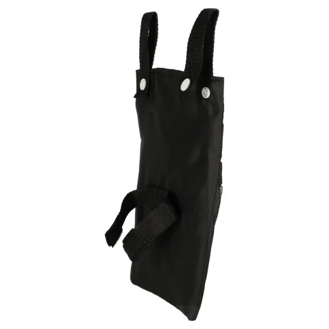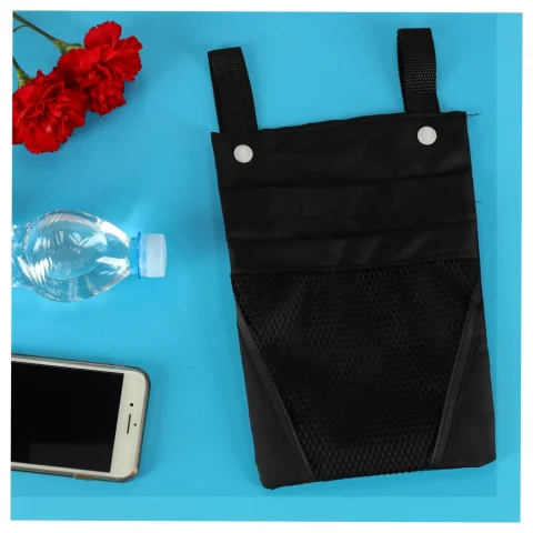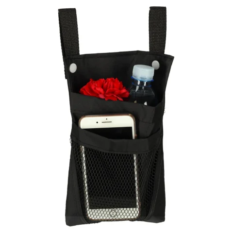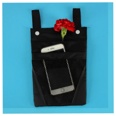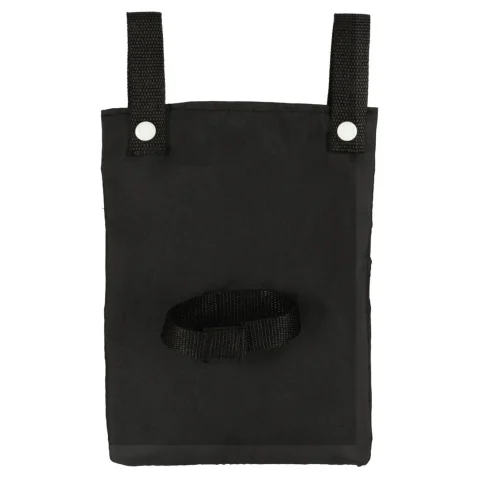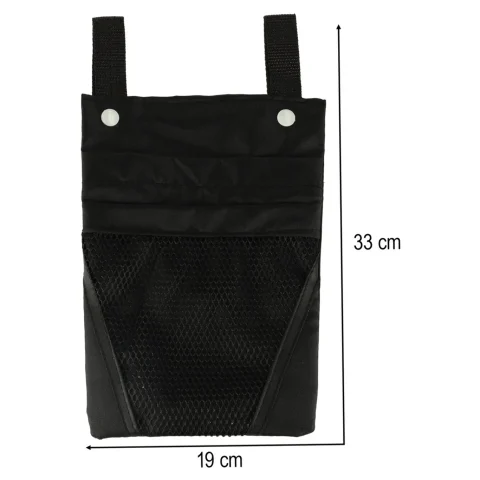 Materiał: Poliester. Kolor: Czarny, Wysokość torebki: 26 cm. Szerokość na dole: 16 cm. Szerokość na górze: 19cm. Montaż: 2 zawieszki z zatrzaskami u góry, 1 rzep z tyłu. 2 kieszonki: Materiałowa: szerokość 16 – (18,5) cm, wysokość 23 cm. Z siatki: szeroko