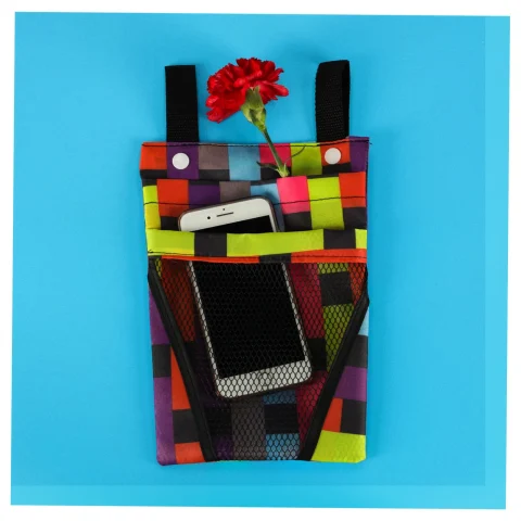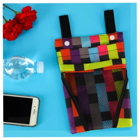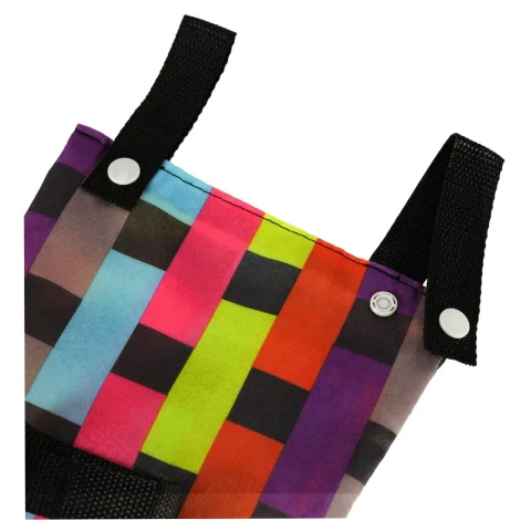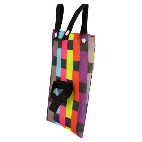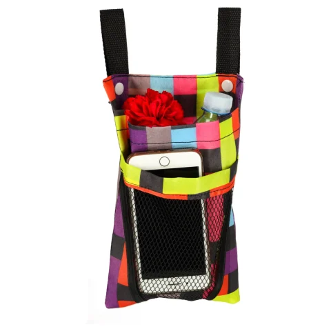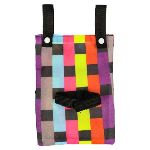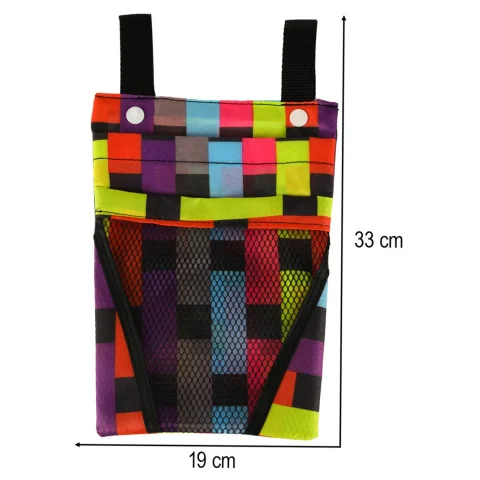 Materiał: Poliester. Kolor: Wielokolorowy, czarny, fioletowy, pomarańczowy, różowy, niebieski, brązowy, zielony. Wysokość torebki: 26 cm. Szerokość na dole: 16 cm. Szerokość na górze: 19cm. Montaż: 2 zawieszki z zatrzaskami u góry, 1 rzep z tyłu. 2 kieszo