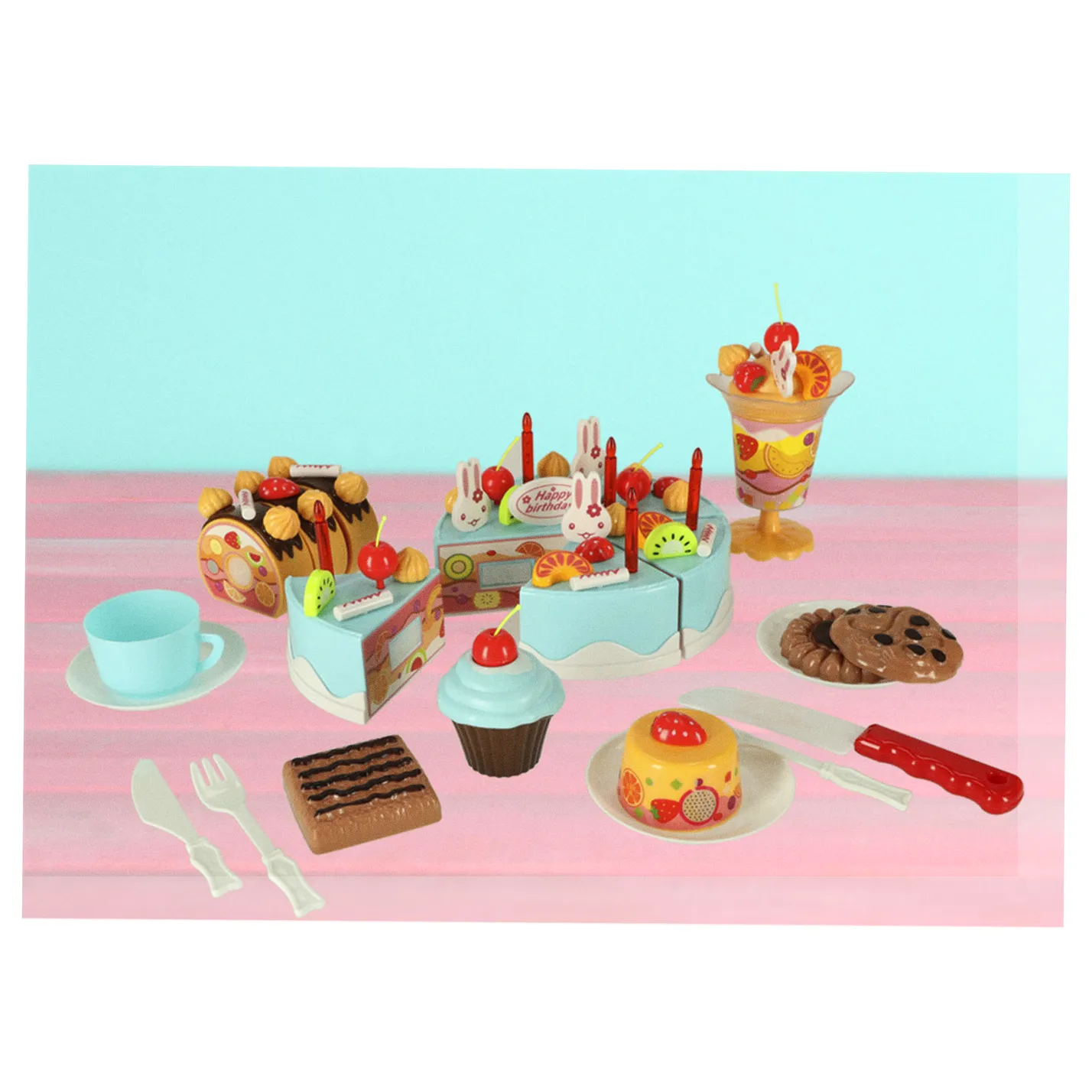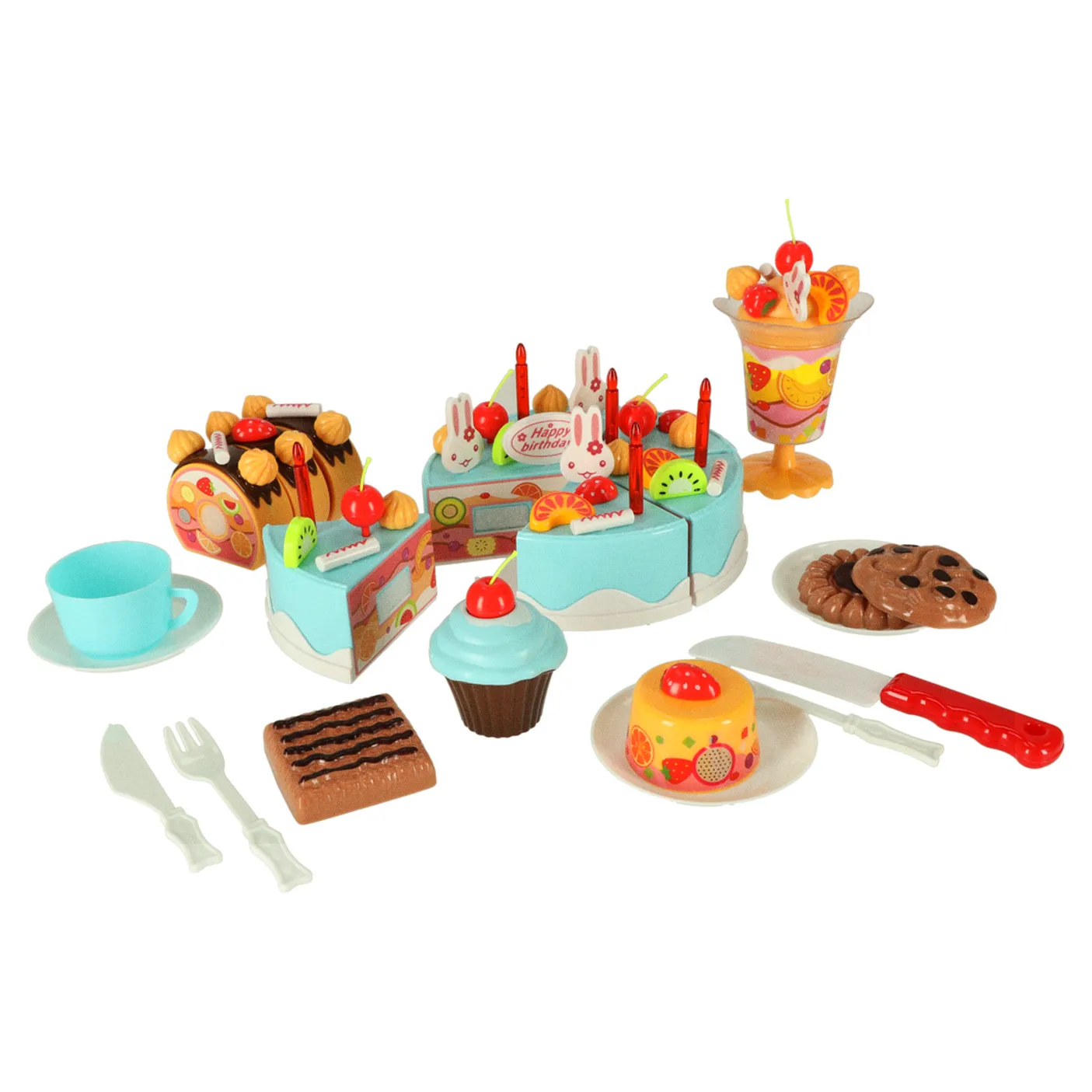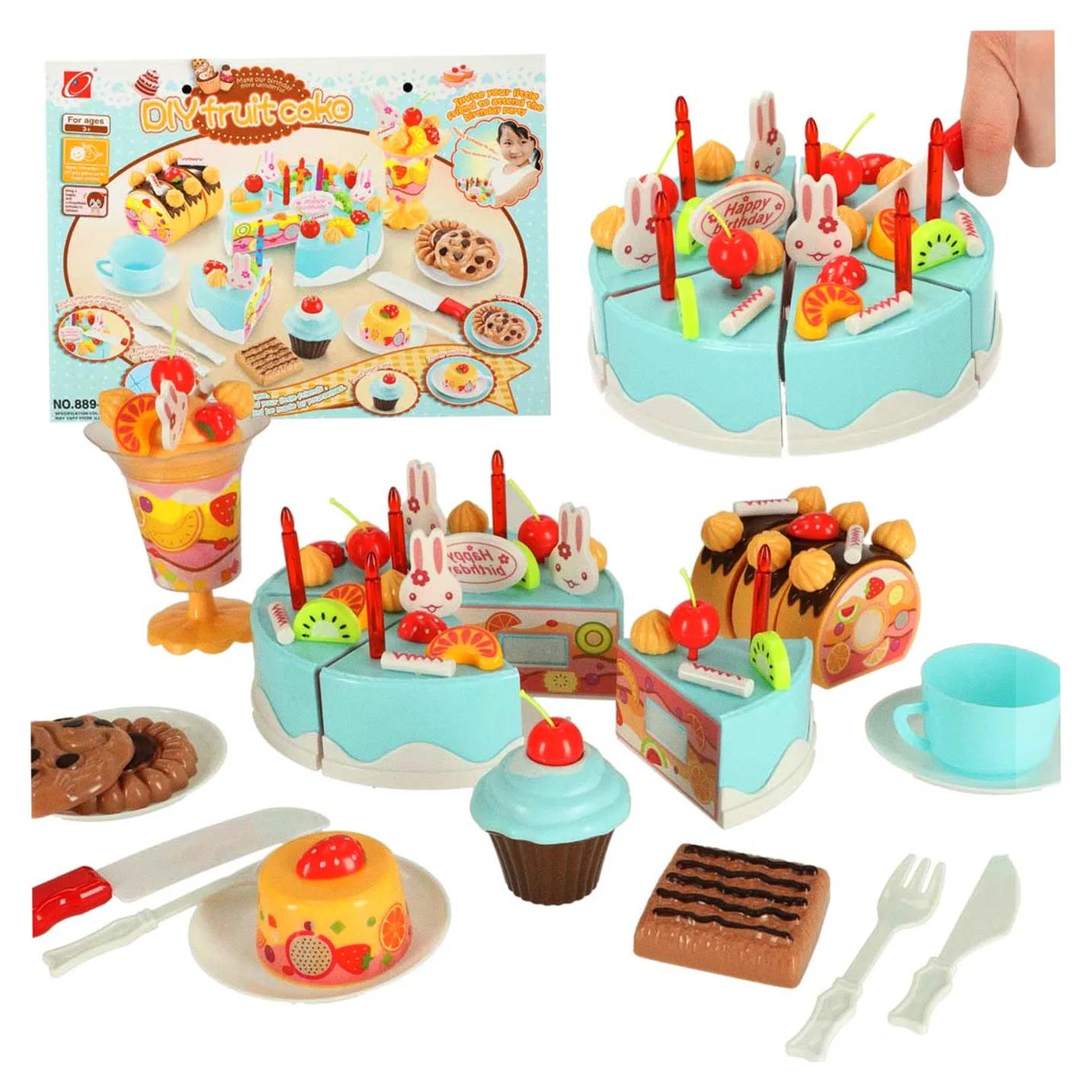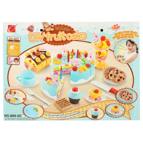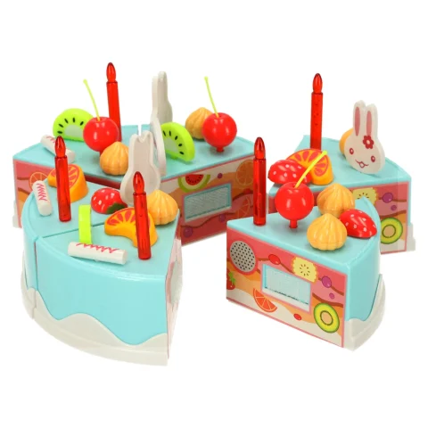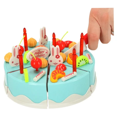 Zestaw tortu urodzinowego to funkcjonalna zabawka składająca się z 6 elementów łączonych na rzepy, umożliwiających krojenie i ponowne składanie. Zestaw 75 elementów zawiera dekoracje, owoce oraz akcesoria do serwowania, zapewniając realistyczną zabawę