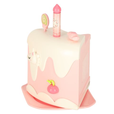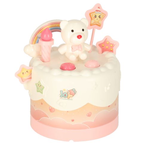 Urodzinowy tort do krojenia zapakowany w eleganckie opakowanie ze wstążką. Ma interaktywne elementy – świeci, obraca się i gra muzykę. W zestawie także świeczki, zastawa oraz nakrycia głowy. Wymiary opakowania: 30 cm x 24 cm x 24 cm
