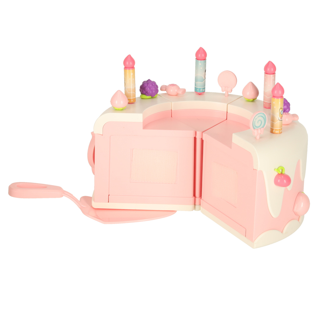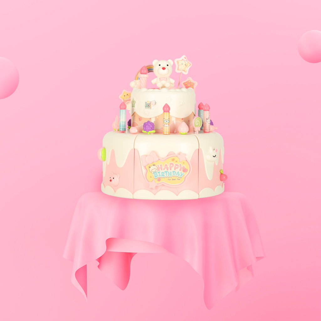 Urodzinowy tort do krojenia zapakowany w eleganckie opakowanie ze wstążką. Ma interaktywne elementy – świeci, obraca się i gra muzykę. W zestawie także świeczki, zastawa oraz nakrycia głowy. Wymiary opakowania: 30 cm x 24 cm x 24 cm
