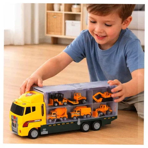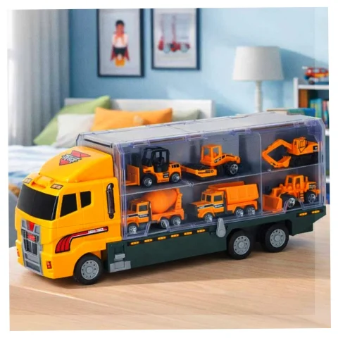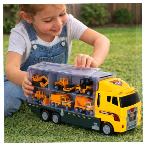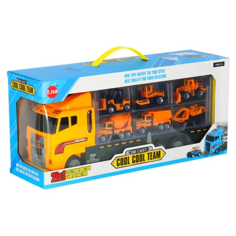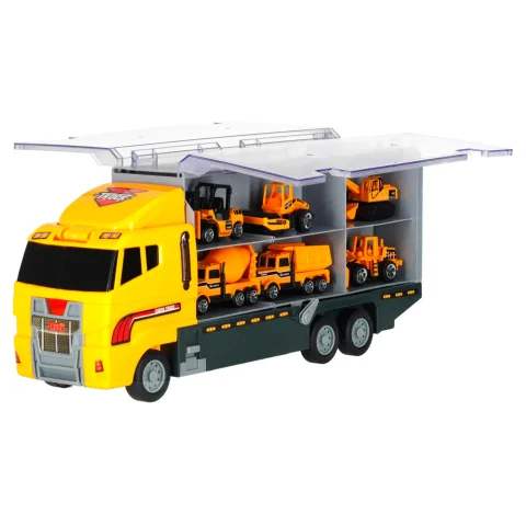 Zestaw pojazdów budowlanych w dużej ciężarówce. Komplet zawiera ciężarówkę, w której umieszczonych jest 6 maszyn: betoniarka, wózek widłowy, koparka, spychacz, wywrotka i walec drogowy. Wymiary ciężarówki: 36x15x10cm, wymiary maszyn: ok. 8x4x3cm.